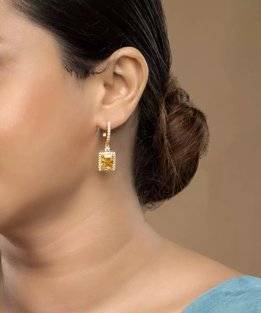 These Gold Plated Yellow Stone Dangler Earrings In Sterling Silver Radiate Warmth And Elegance. The Vibrant Yellow Stones Sparkle Beautifully, Contrasting Perfectly With The Lustrous Gold Plating. Crafted From High Quality Sterling Silver, They Are Lightweight, Durable, And Comfortable To Wear, Making Them An Ideal Accessory For Festive Occasions, Parties, Or Adding A Touch Of Glamour To Everyday Outfits.