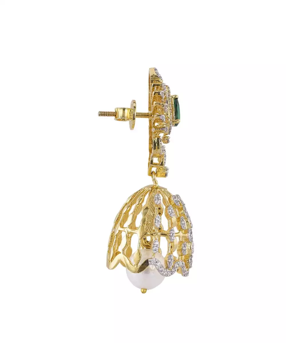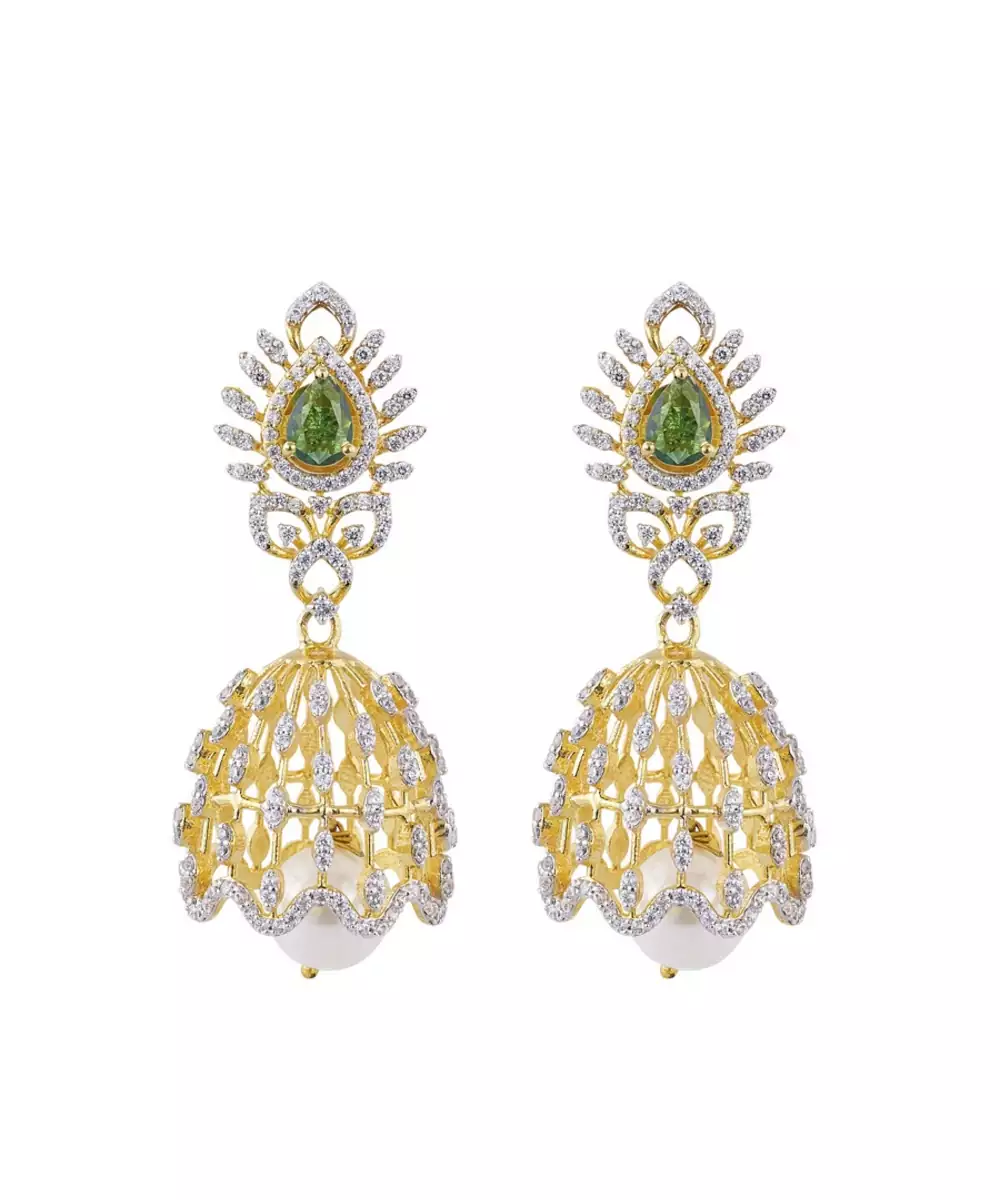 These Gold Plated Green Stone Jhumkas In Sterling Silver Beautifully Blend Traditional Design With Modern Elegance. Featuring Vibrant Green Stones Set Against A Rich Gold Finish, They Exude Festive Charm. Crafted With Sterling Silver For Durability, These Lightweight Jhumkas Are Perfect For Weddings, Celebrations, Or Adding Grace To Everyday Ethnic Wear.