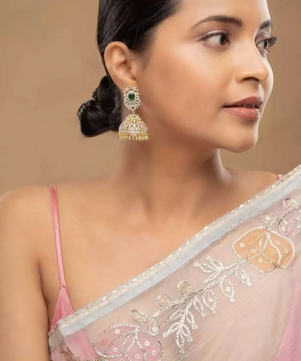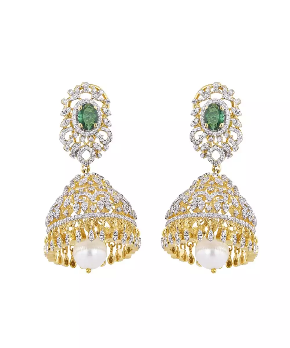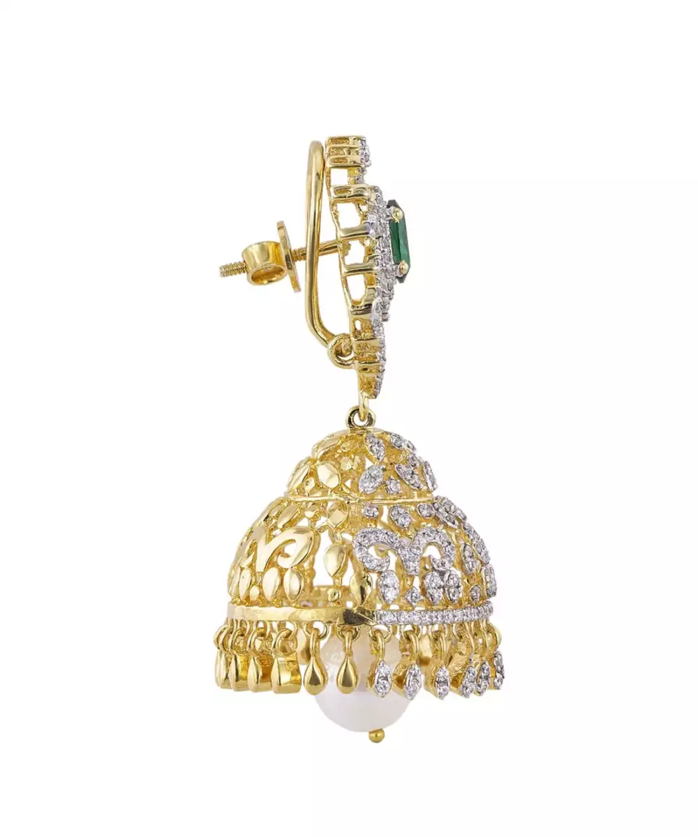 These Gold Plated Green Stone Jhumkas In Sterling Silver Beautifully Blend Traditional Design With Modern Elegance. Featuring Vibrant Green Stones Set Against A Rich Gold Finish, They Exude Festive Charm. Crafted With Sterling Silver For Durability, These Lightweight Jhumkas Are Perfect For Weddings, Celebrations, Or Adding Grace To Everyday Ethnic Wear.