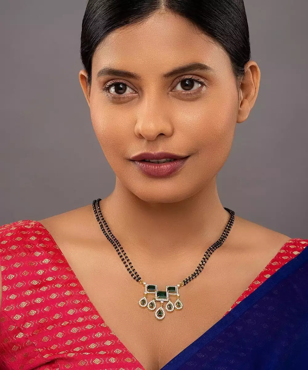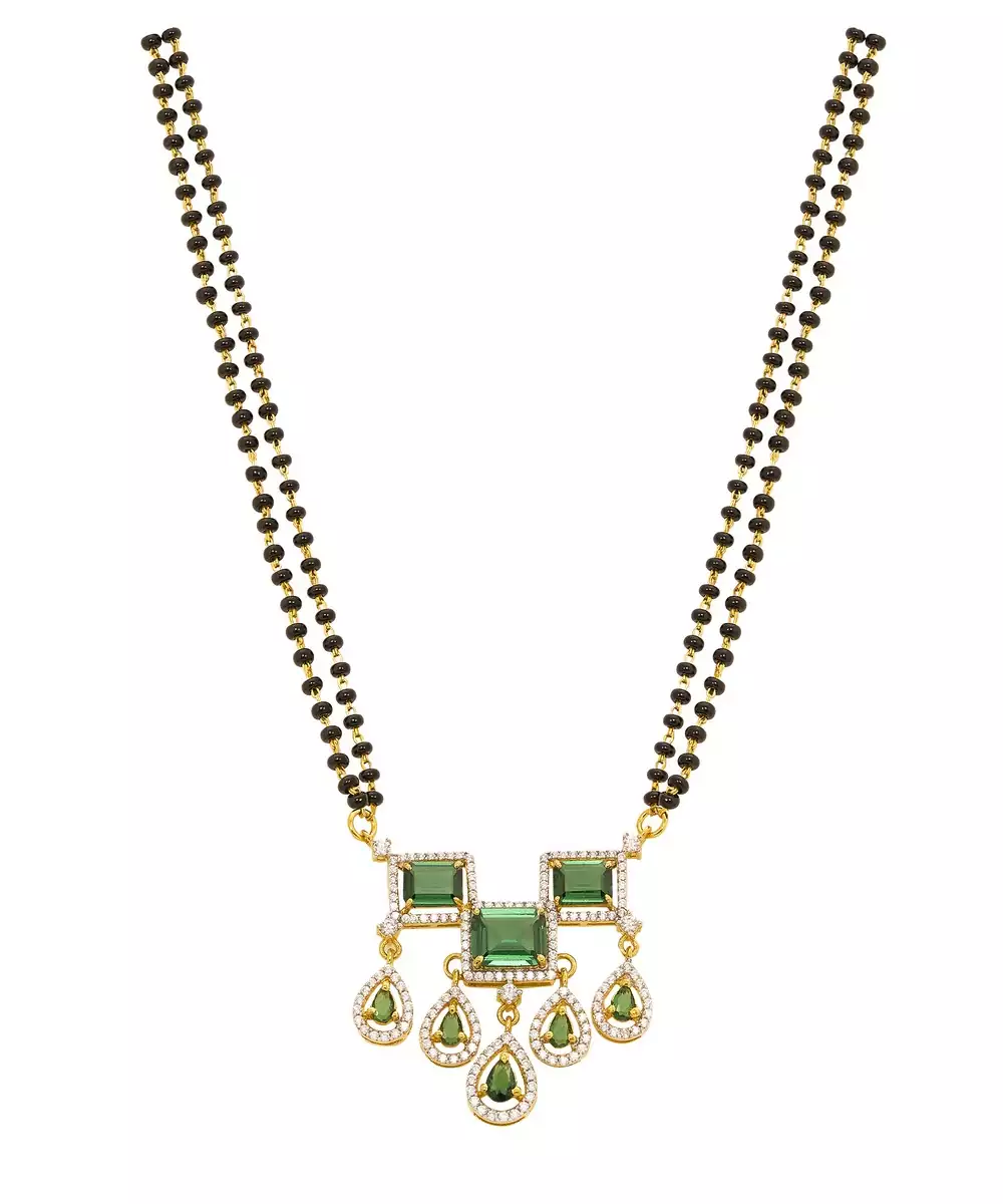 This Elegant Gold Plated Green Stone Mangalsutra Beautifully Blends Tradition With Modern Sophistication. Featuring A Radiant Gold Finish And Striking Green Stone Accents, It Symbolizes Love And Grace. Perfect For Daily Wear Or Special Occasions, This Mangalsutra Adds A Touch Of Elegance And Vibrant Charm To Your Look.