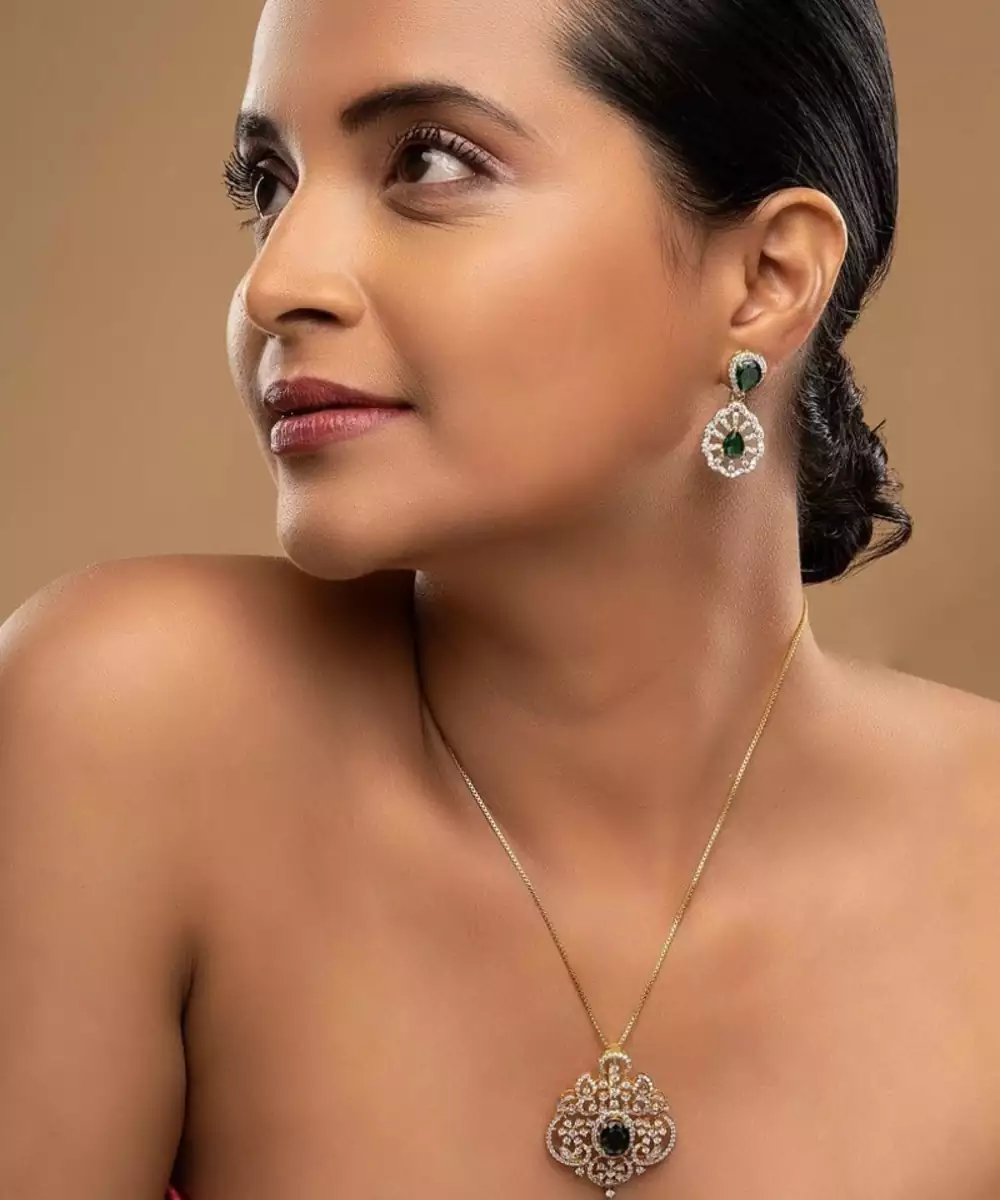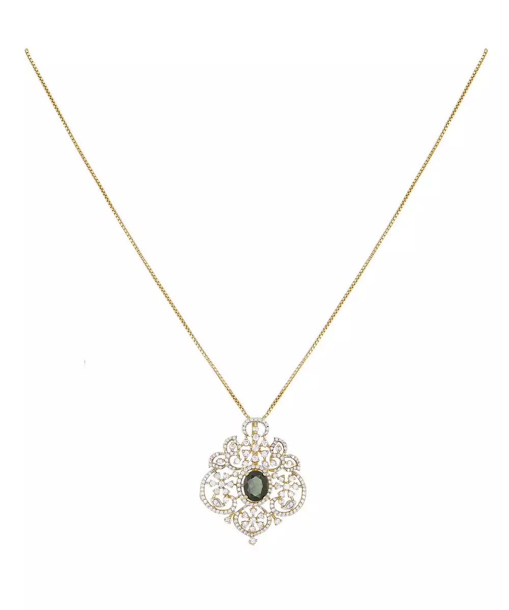 This Beautiful Gold Plated Green Stone Pendant Necklace Combines Classic Elegance With Modern Charm. The Vibrant Green Stone Centerpiece Shines Brilliantly Against The Lustrous Gold Finish, Creating A Luxurious Look. Perfect For Parties, Celebrations, Or Daily Wear, It Adds A Touch Of Sophistication And Timeless Beauty To Any Outfit.