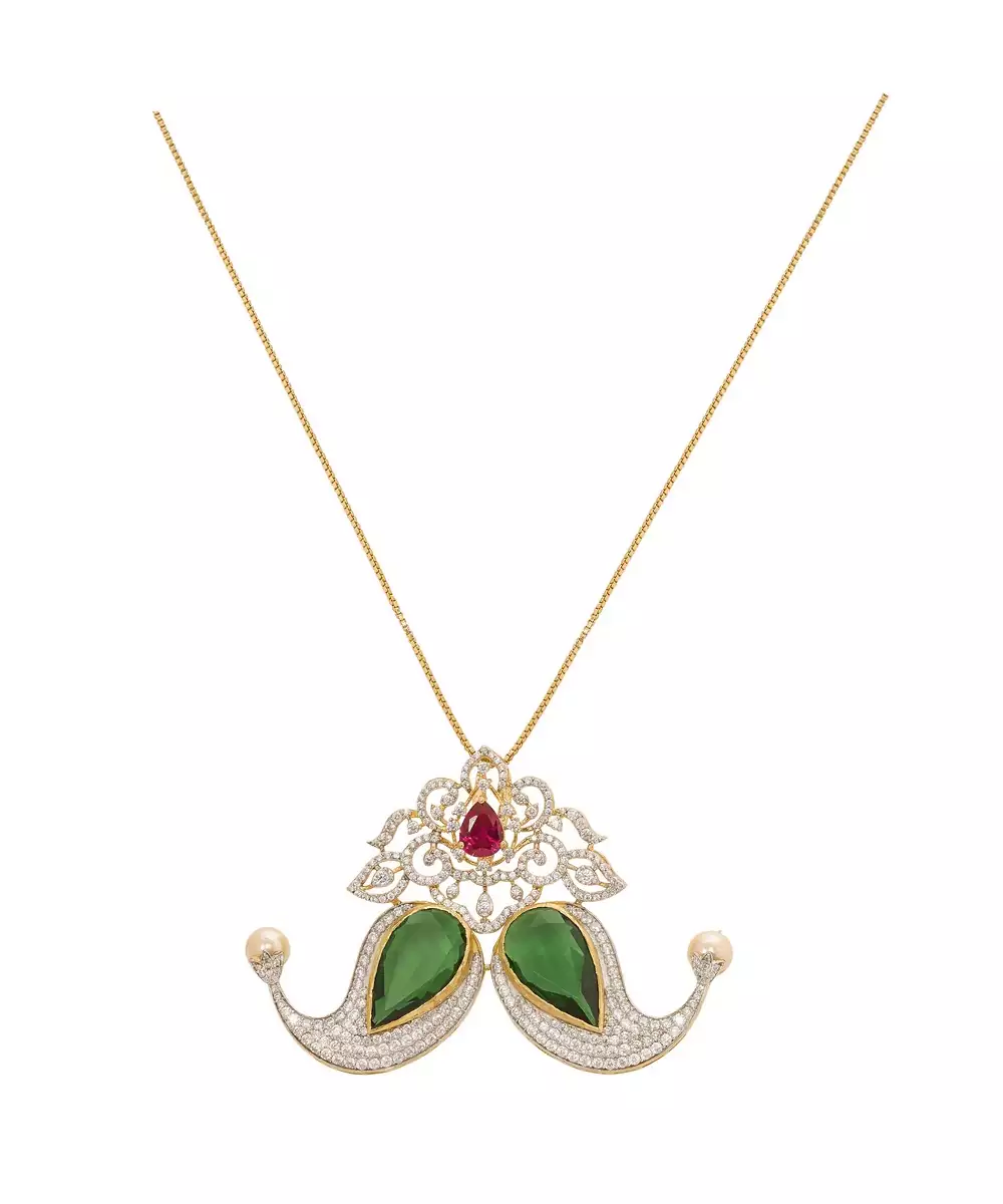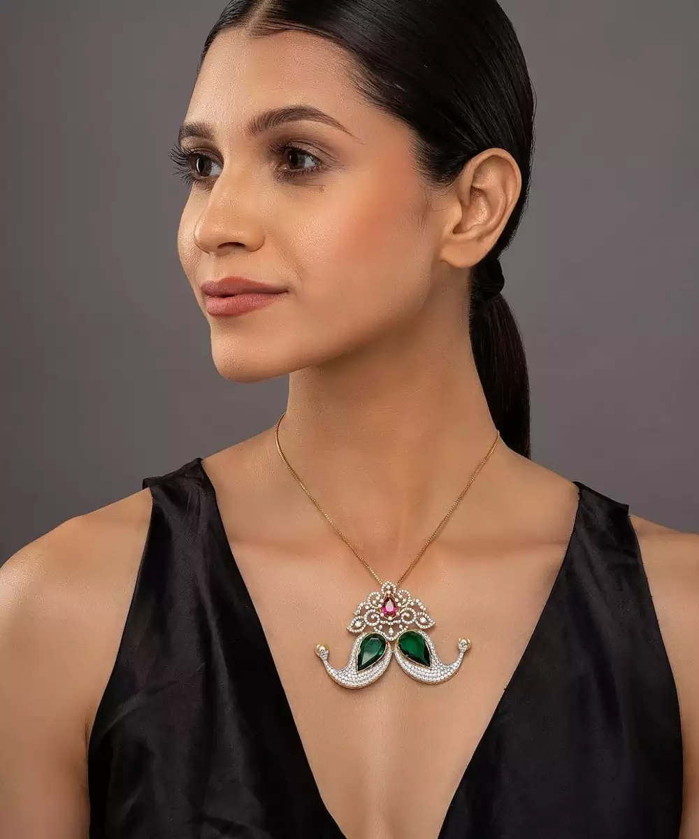 This Beautiful Gold Plated Green Stone Pendant Necklace Combines Classic Elegance With Modern Charm. The Vibrant Green Stone Centerpiece Shines Brilliantly Against The Lustrous Gold Finish, Creating A Luxurious Look. Perfect For Parties, Celebrations, Or Daily Wear, It Adds A Touch Of Sophistication And Timeless Beauty To Any Outfit.