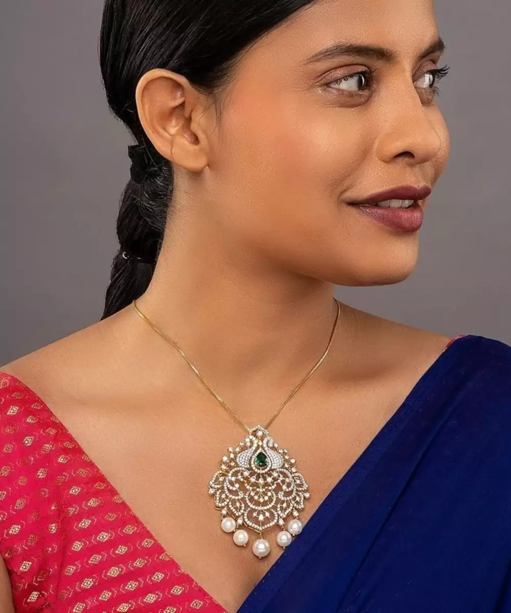 This Beautiful Gold Plated Green Stone Pendant Necklace Combines Classic Elegance With Modern Charm. The Vibrant Green Stone Centerpiece Shines Brilliantly Against The Lustrous Gold Finish, Creating A Luxurious Look. Perfect For Parties, Celebrations, Or Daily Wear, It Adds A Touch Of Sophistication And Timeless Beauty To Any Outfit.