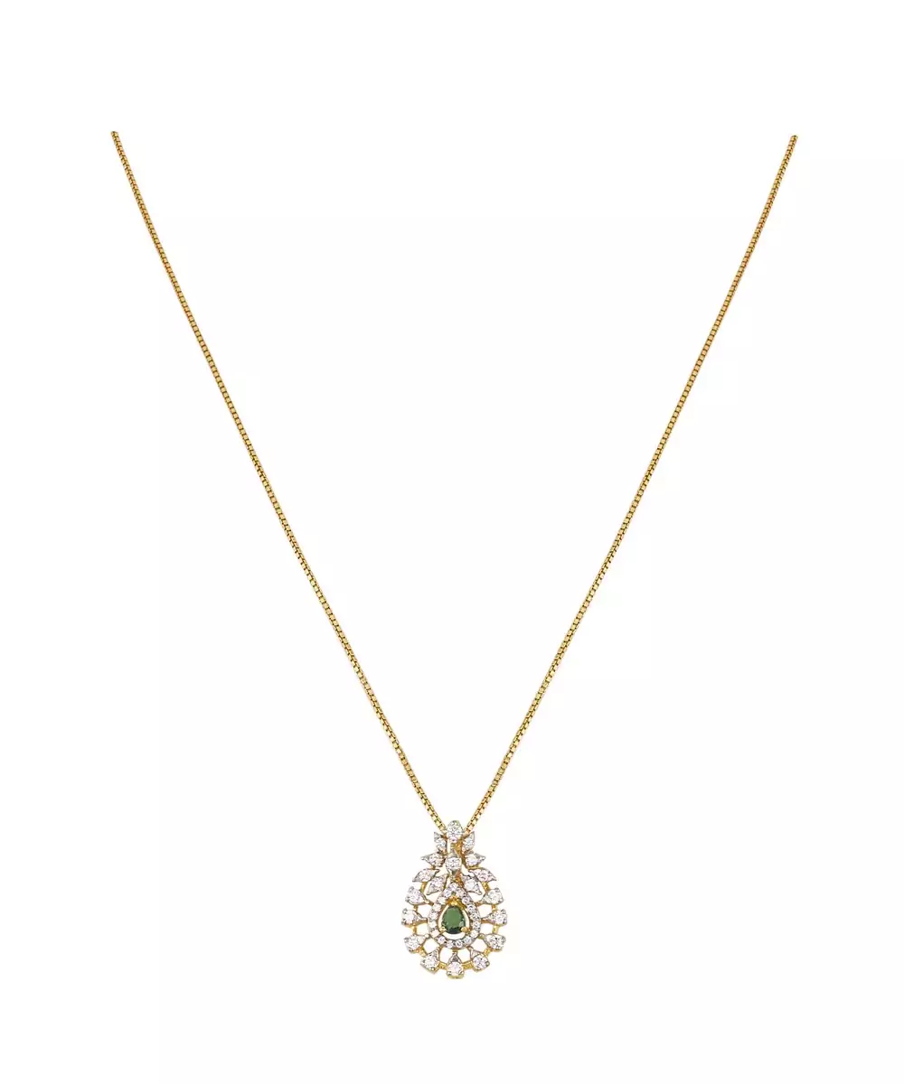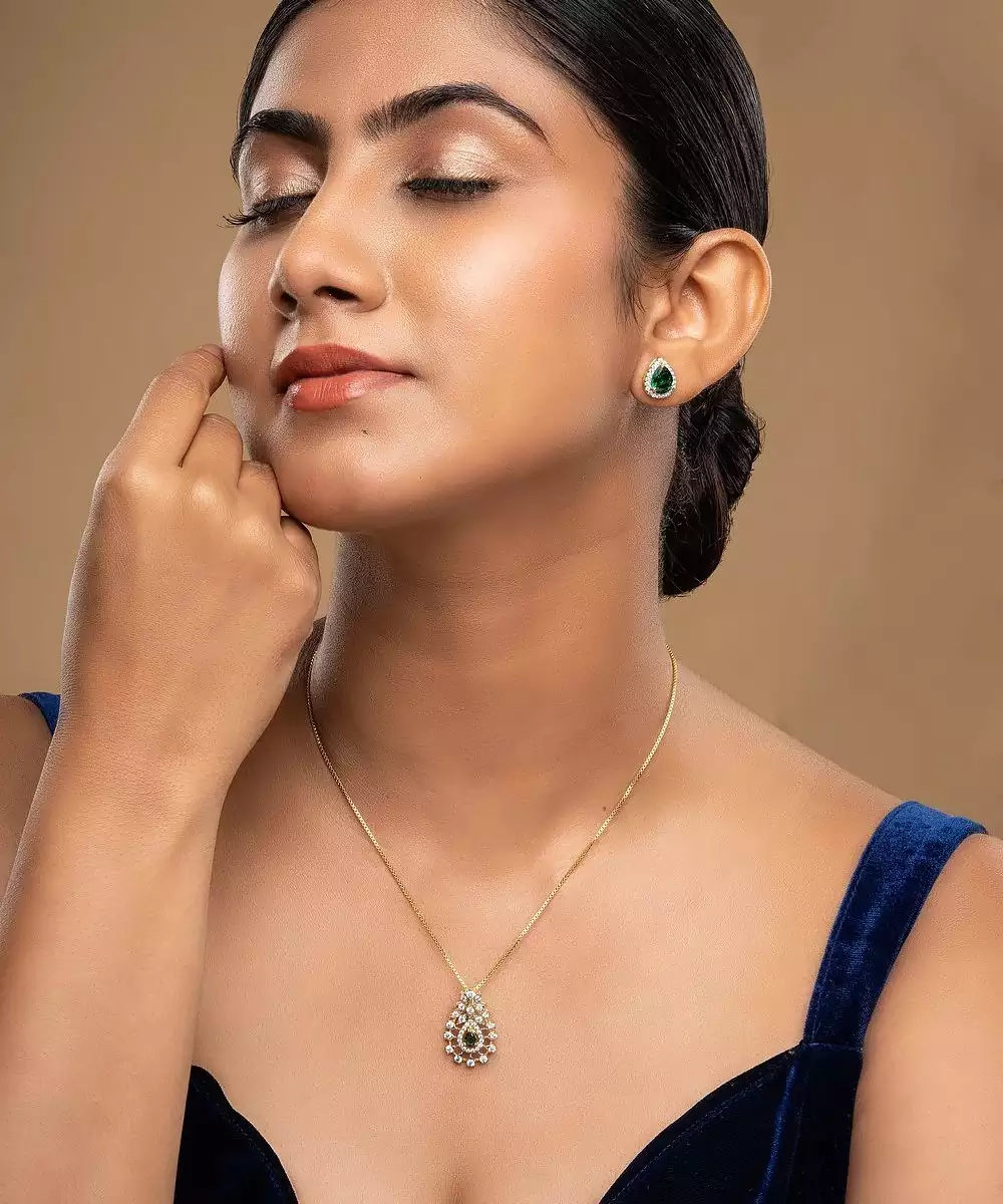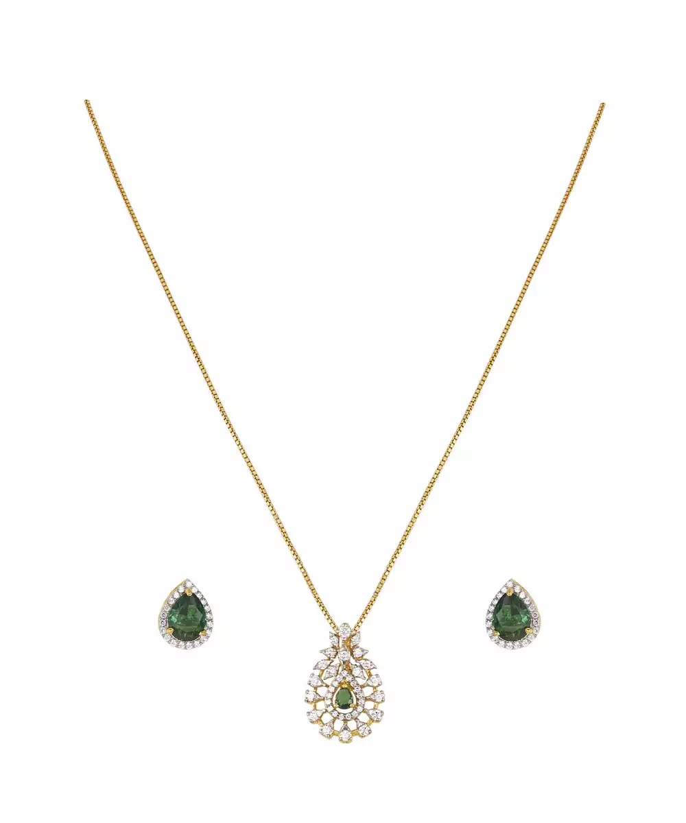 This Exquisite Gold Plated Green Stone Pendant Necklace Set Radiates Elegance And Sophistication. Featuring A Stunning Green Gemstone Centerpiece, It Perfectly Complements The Matching Earrings For A Coordinated Look. Ideal For Festive Occasions Or Evening Wear, This Set Adds A Regal Charm And A Graceful Glow To Any Outfit.