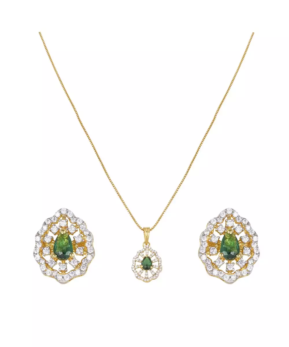 This Exquisite Gold Plated Green Stone Pendant Necklace Set Radiates Elegance And Sophistication. Featuring A Stunning Green Gemstone Centerpiece, It Perfectly Complements The Matching Earrings For A Coordinated Look. Ideal For Festive Occasions Or Evening Wear, This Set Adds A Regal Charm And A Graceful Glow To Any Outfit.