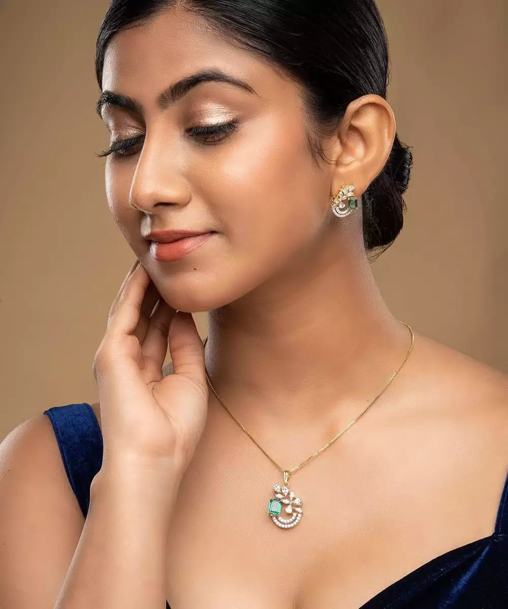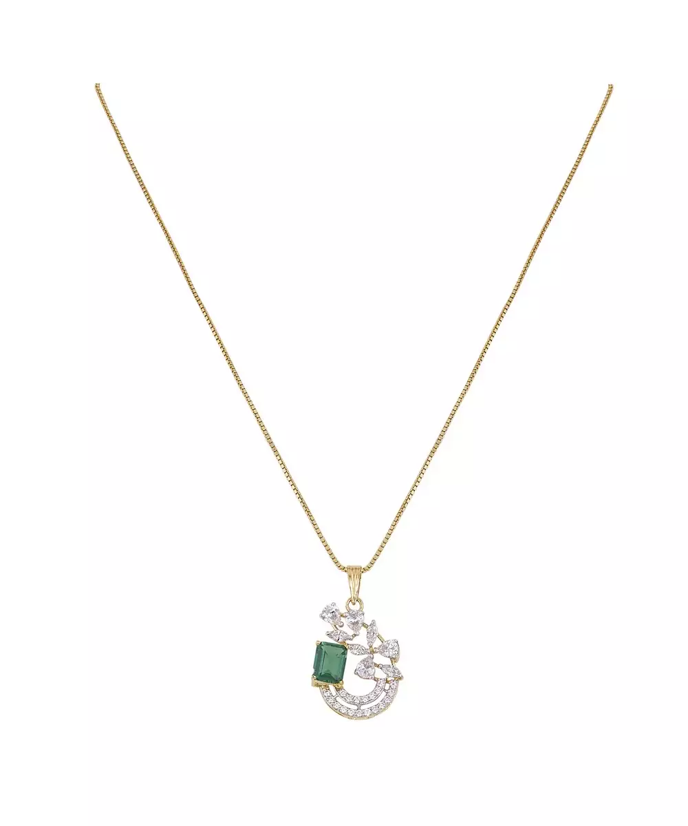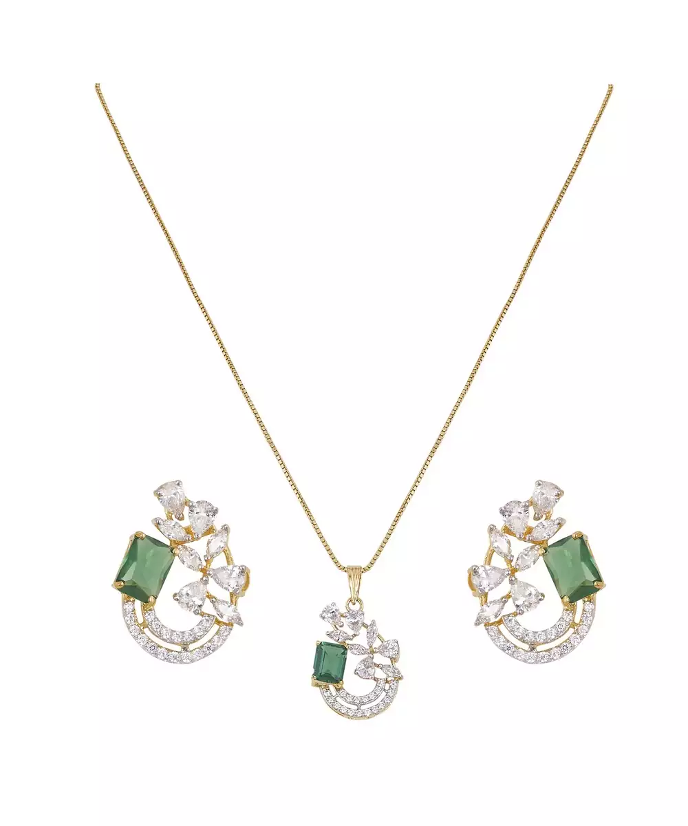 This Exquisite Gold Plated Green Stone Pendant Necklace Set Radiates Elegance And Sophistication. Featuring A Stunning Green Gemstone Centerpiece, It Perfectly Complements The Matching Earrings For A Coordinated Look. Ideal For Festive Occasions Or Evening Wear, This Set Adds A Regal Charm And A Graceful Glow To Any Outfit.