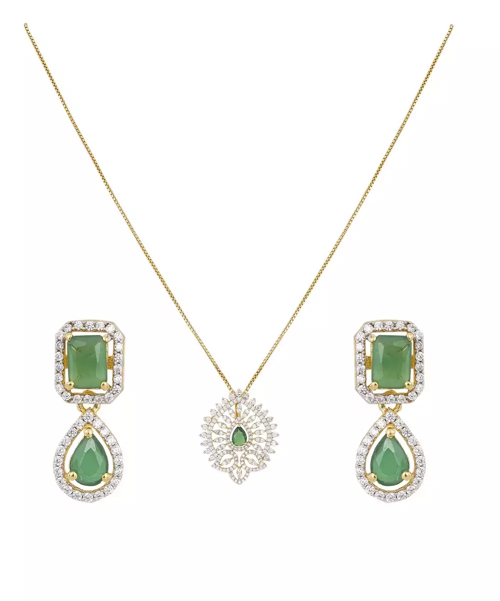 This Exquisite Gold Plated Green Stone Pendant Necklace Set Radiates Elegance And Sophistication. Featuring A Stunning Green Gemstone Centerpiece, It Perfectly Complements The Matching Earrings For A Coordinated Look. Ideal For Festive Occasions Or Evening Wear, This Set Adds A Regal Charm And A Graceful Glow To Any Outfit.