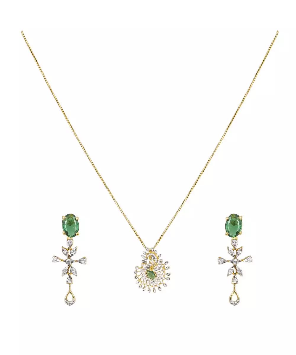 This Exquisite Gold Plated Green Stone Pendant Necklace Set Radiates Elegance And Sophistication. Featuring A Stunning Green Gemstone Centerpiece, It Perfectly Complements The Matching Earrings For A Coordinated Look. Ideal For Festive Occasions Or Evening Wear, This Set Adds A Regal Charm And A Graceful Glow To Any Outfit.