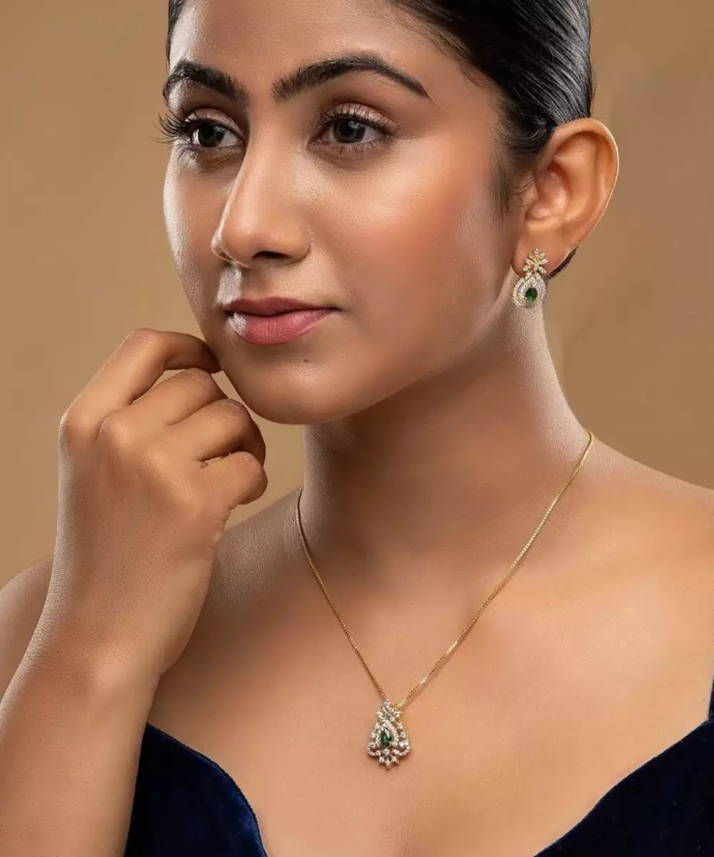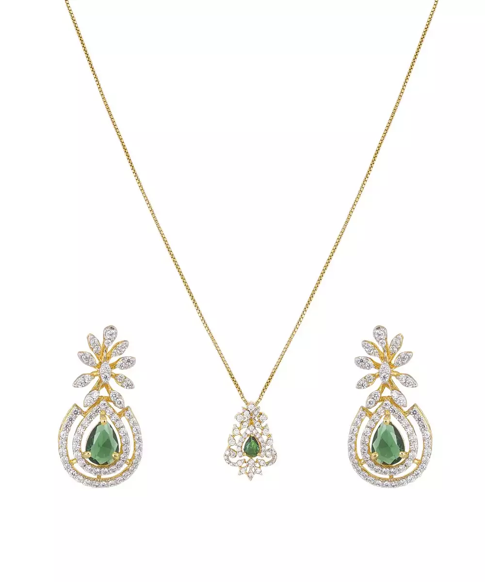 This Exquisite Gold Plated Green Stone Pendant Necklace Set Radiates Elegance And Sophistication. Featuring A Stunning Green Gemstone Centerpiece, It Perfectly Complements The Matching Earrings For A Coordinated Look. Ideal For Festive Occasions Or Evening Wear, This Set Adds A Regal Charm And A Graceful Glow To Any Outfit.