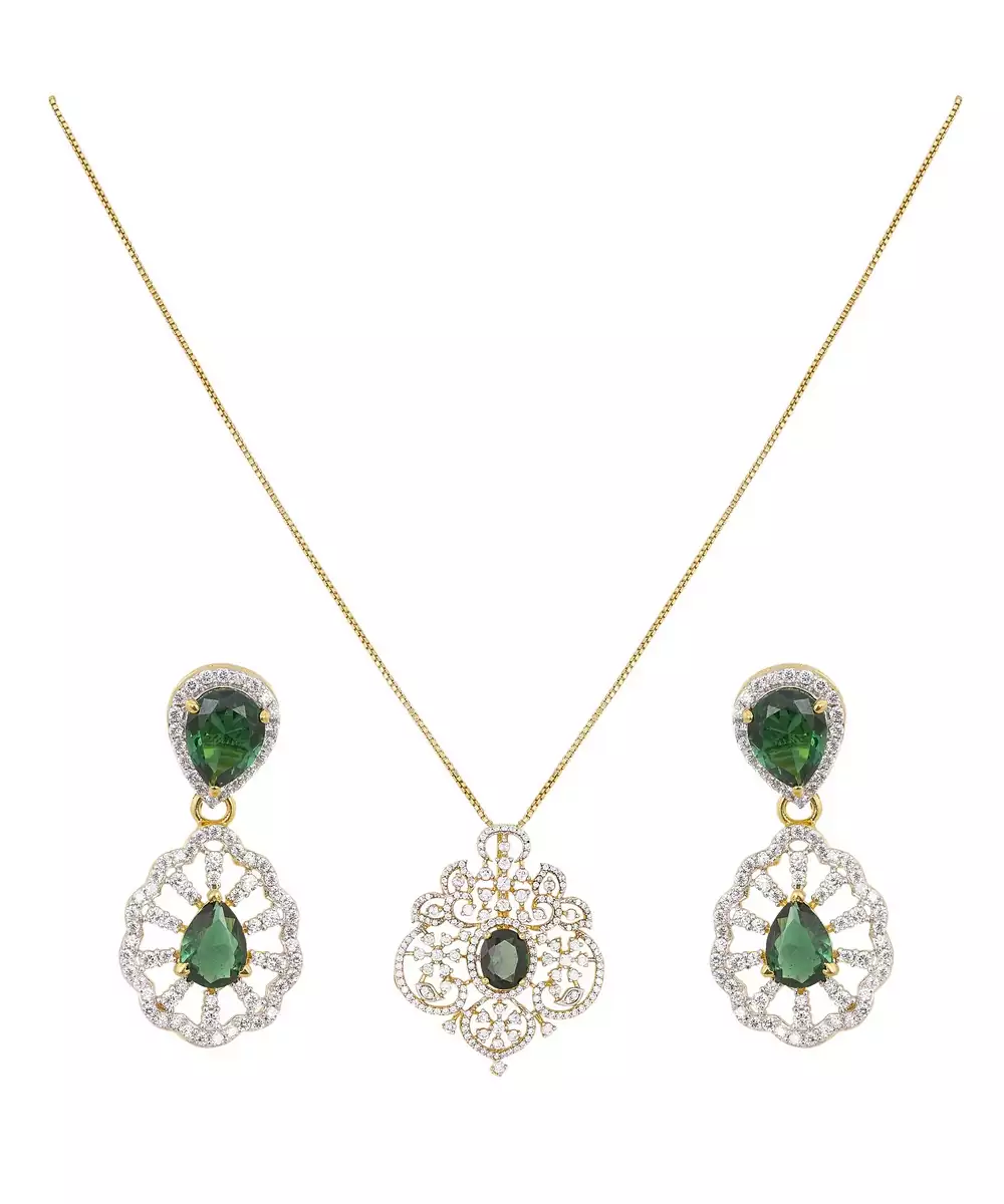 This Exquisite Gold Plated Green Stone Pendant Necklace Set Radiates Elegance And Sophistication. Featuring A Stunning Green Gemstone Centerpiece, It Perfectly Complements The Matching Earrings For A Coordinated Look. Ideal For Festive Occasions Or Evening Wear, This Set Adds A Regal Charm And A Graceful Glow To Any Outfit.