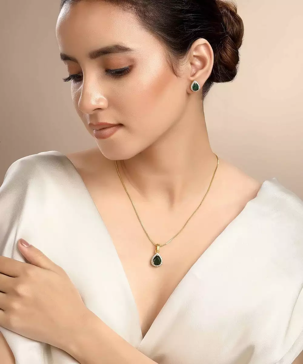 This Exquisite Gold Plated Green Stone Pendant Necklace Set Radiates Elegance And Sophistication. Featuring A Stunning Green Gemstone Centerpiece, It Perfectly Complements The Matching Earrings For A Coordinated Look. Ideal For Festive Occasions Or Evening Wear, This Set Adds A Regal Charm And A Graceful Glow To Any Outfit.