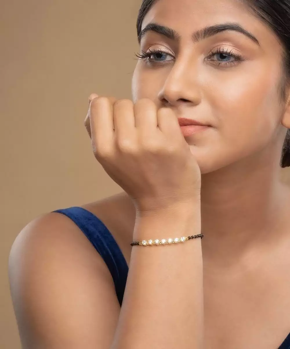 This Gold Plated Hand Mangalsutra Crafted In Sterling Silver Blends Modern Elegance With Traditional Significance. Its Sleek Design Features A Delicate Black Beaded Chain Paired With A Minimal Pendant, Offering A Timeless Appeal. Lightweight And Versatile, It Is Perfect For Daily Wear Or Special Occasions, Symbolizing Love And Commitment In Style.