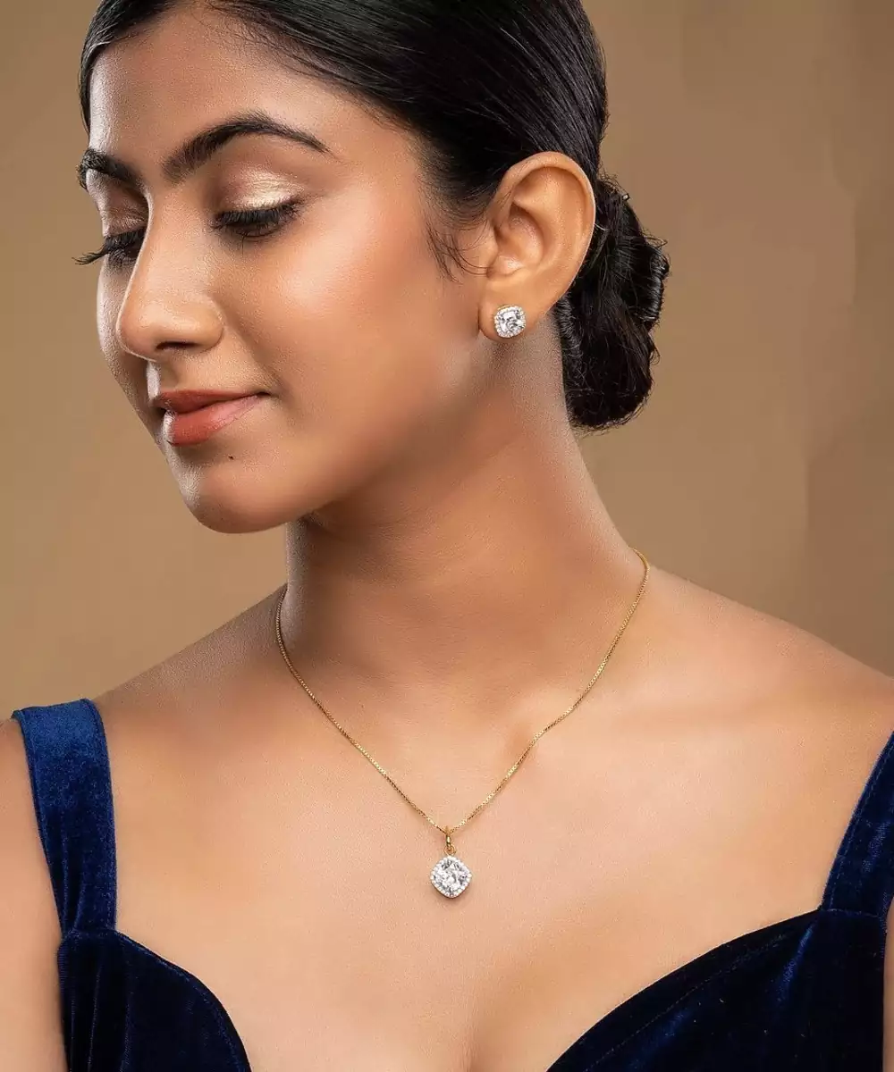 This Elegant Gold Plated Pendant Necklace Set Showcases Timeless Beauty And Refined Craftsmanship. Featuring A Sleek Pendant Paired With Matching Earrings, It Adds A Graceful Charm To Any Outfit. Perfect For Both Casual And Festive Occasions, This Set Enhances Your Look With A Touch Of Golden Sophistication And Elegance.