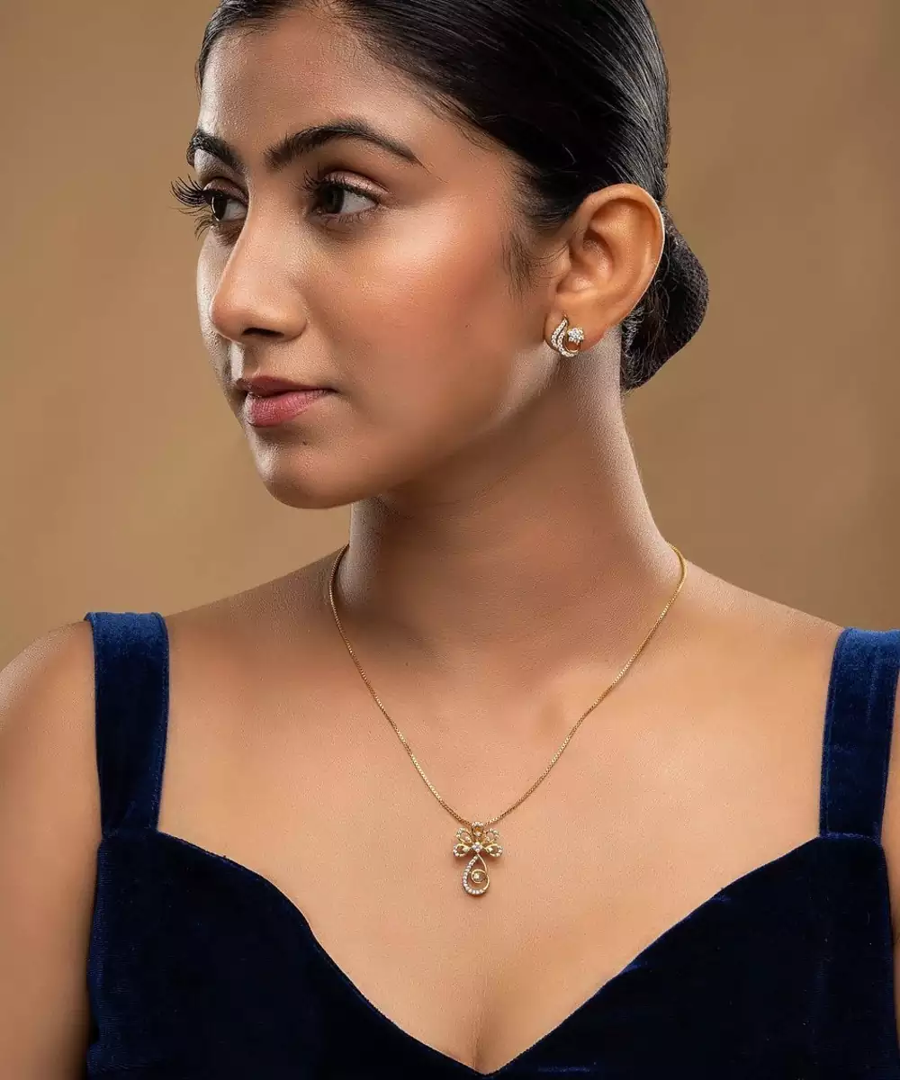 This Elegant Gold Plated Pendant Necklace Set Showcases Timeless Beauty And Refined Craftsmanship. Featuring A Sleek Pendant Paired With Matching Earrings, It Adds A Graceful Charm To Any Outfit. Perfect For Both Casual And Festive Occasions, This Set Enhances Your Look With A Touch Of Golden Sophistication And Elegance.