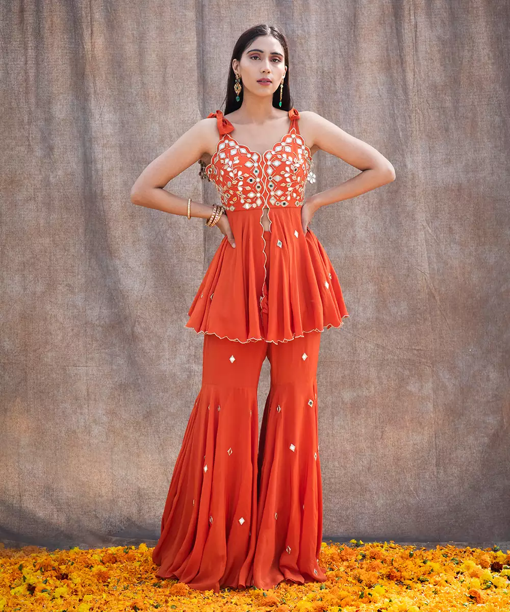 Mirror Work Scalloped Peplum With Tie Up Straps And Fit'n'flare Pant Set.
