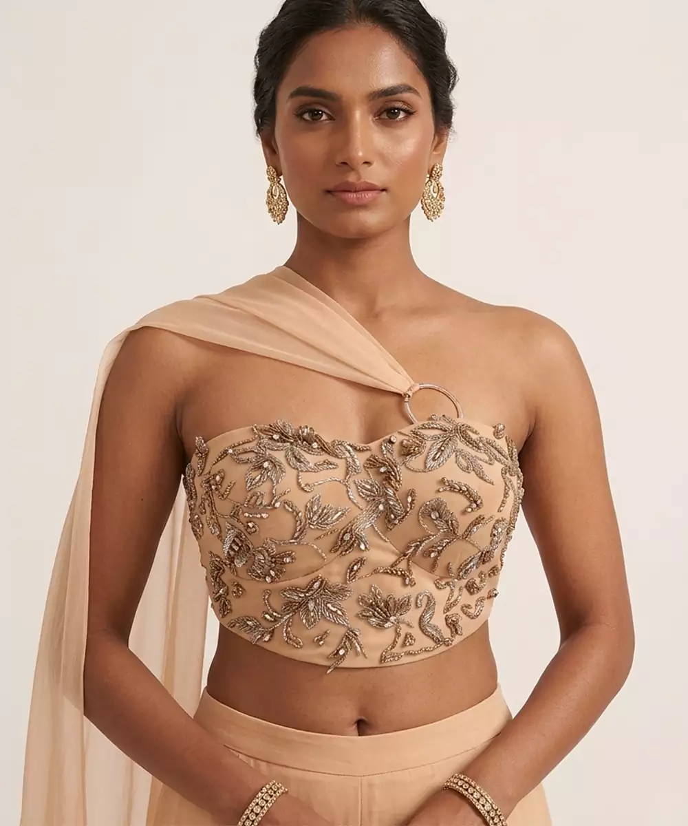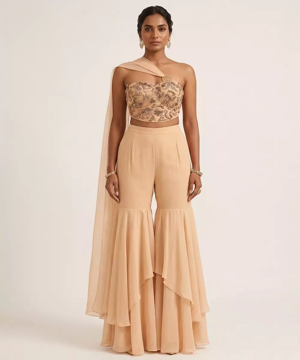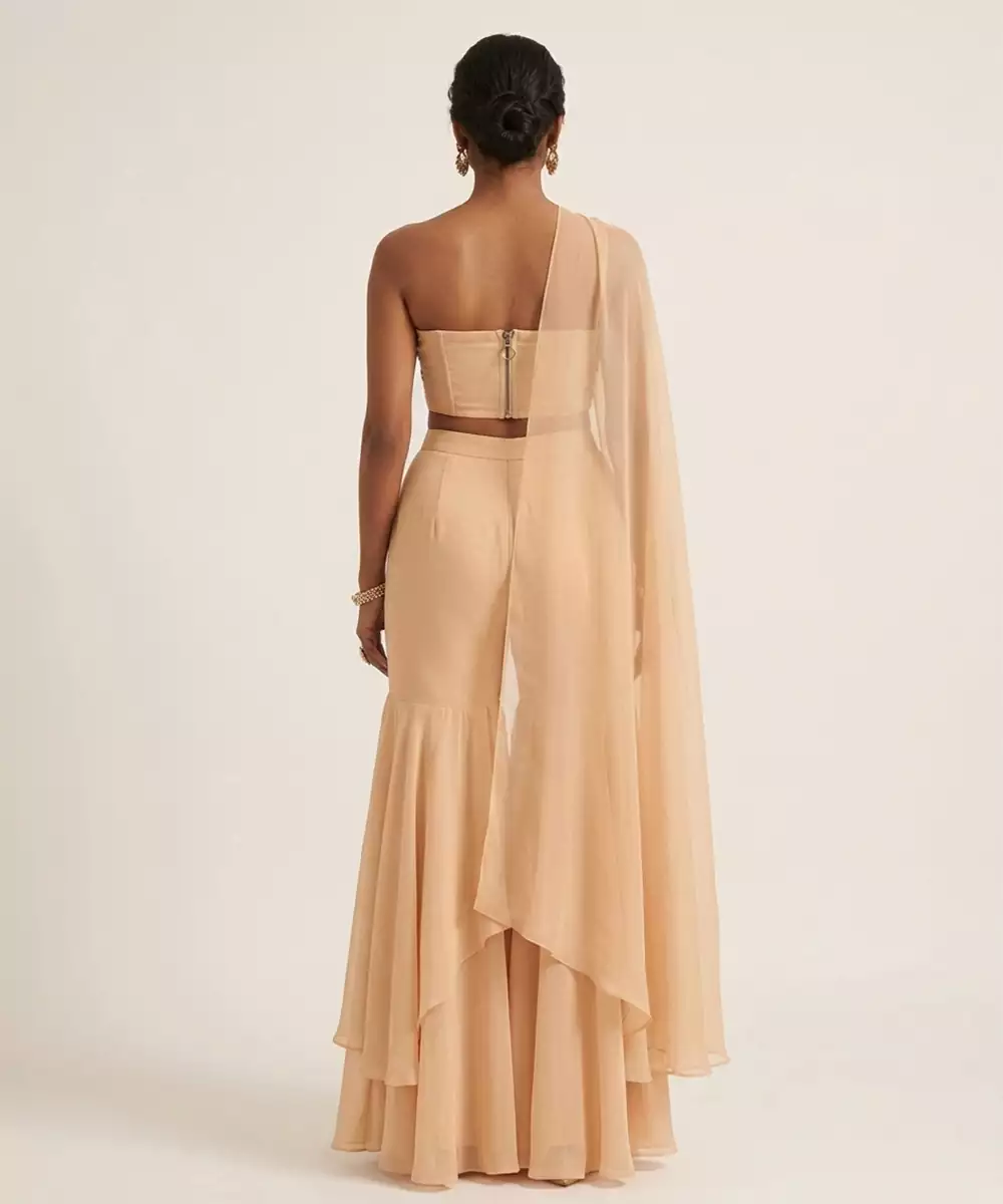 This Beige Georgette Fusion Sharara Set Blends Traditional Embroidery With A Contemporary Silhouette. The Lightweight Fabric Ensures Comfort While Maintaining Elegance. Ideal For Festive Occasions, It Pairs Effortlessly With Modern Accessories To Create A Chic And Sophisticated Look With A Touch Of Ethnic Charm.