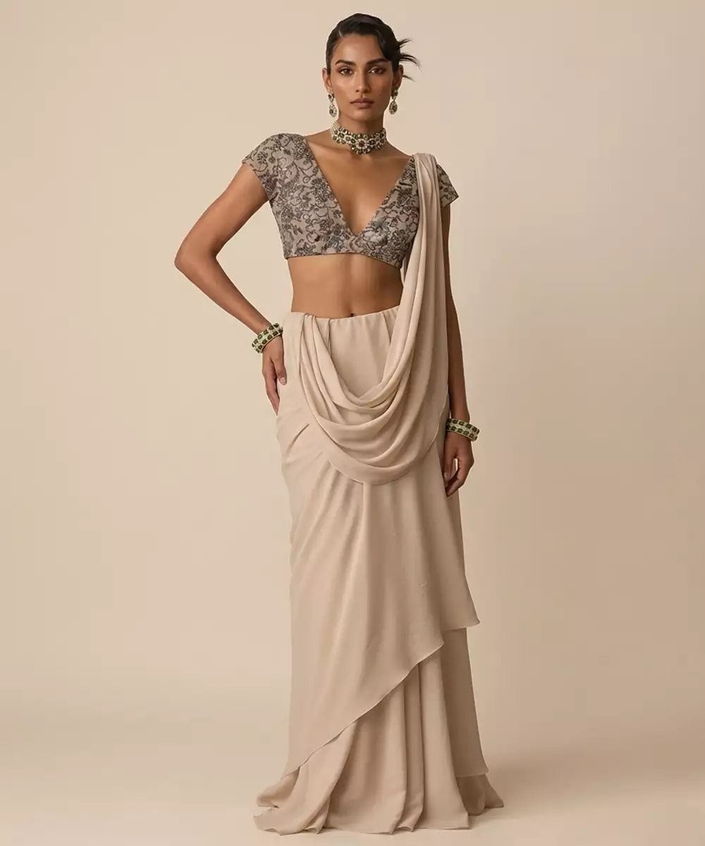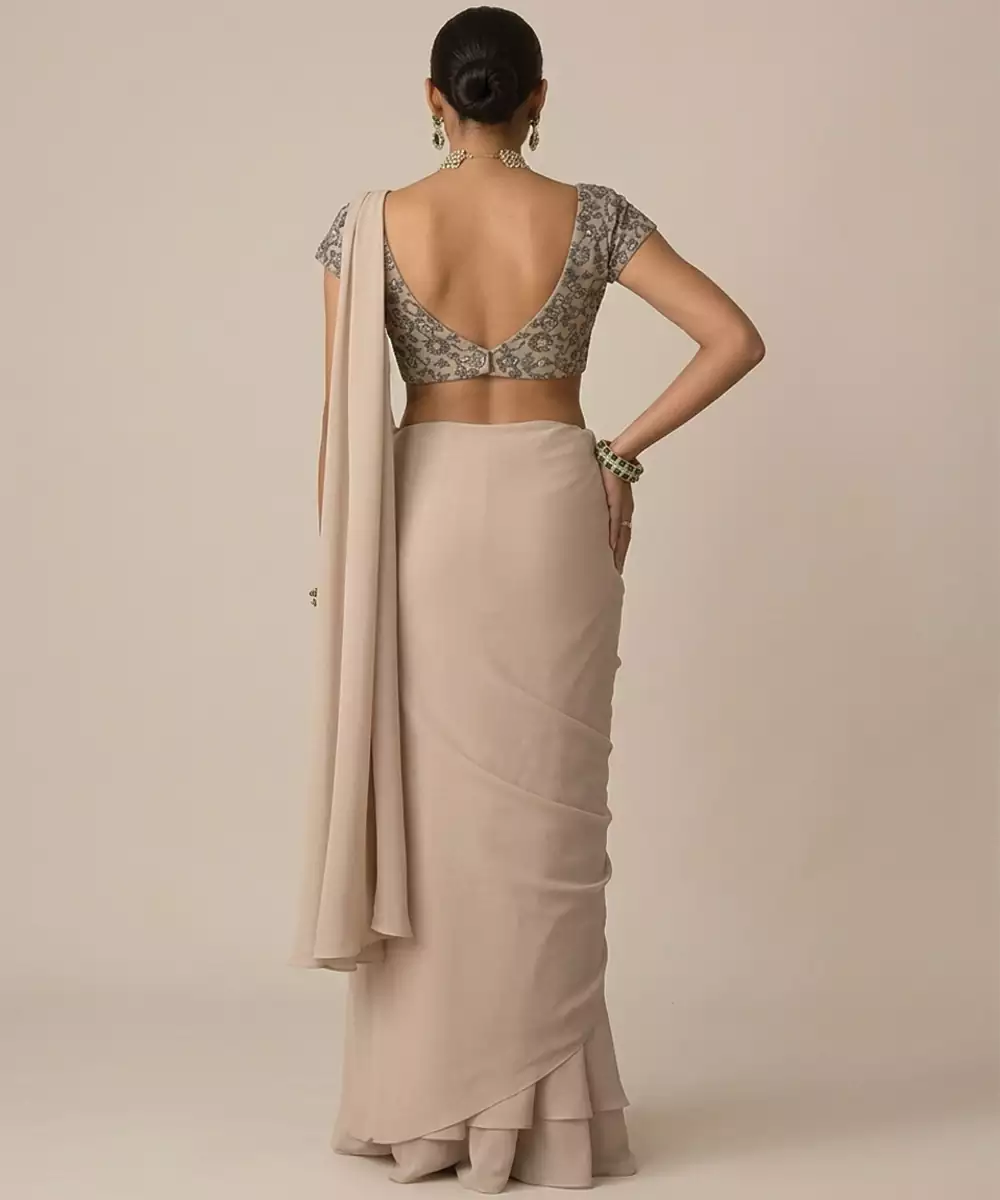 This Beige Net Pre Draped Saree Set Features Delicate Embroidery That Enhances Its Soft And Elegant Appeal. The Lightweight Fabric And Ready To Wear Design Ensure Comfort And Ease. Perfect For Festive Occasions Or Evening Events, It Pairs Beautifully With Statement Jewelry For A Refined And Graceful Look.