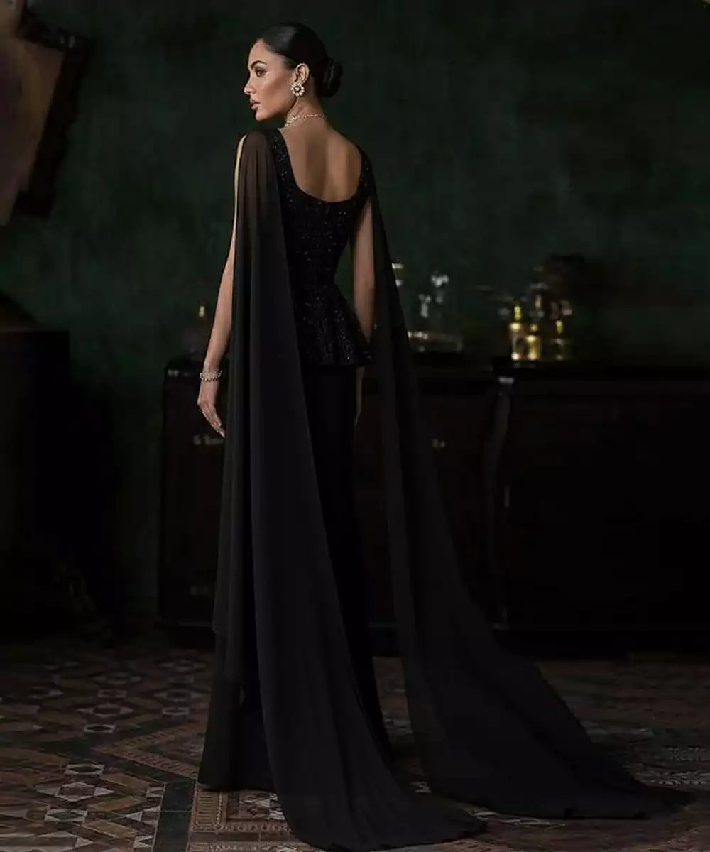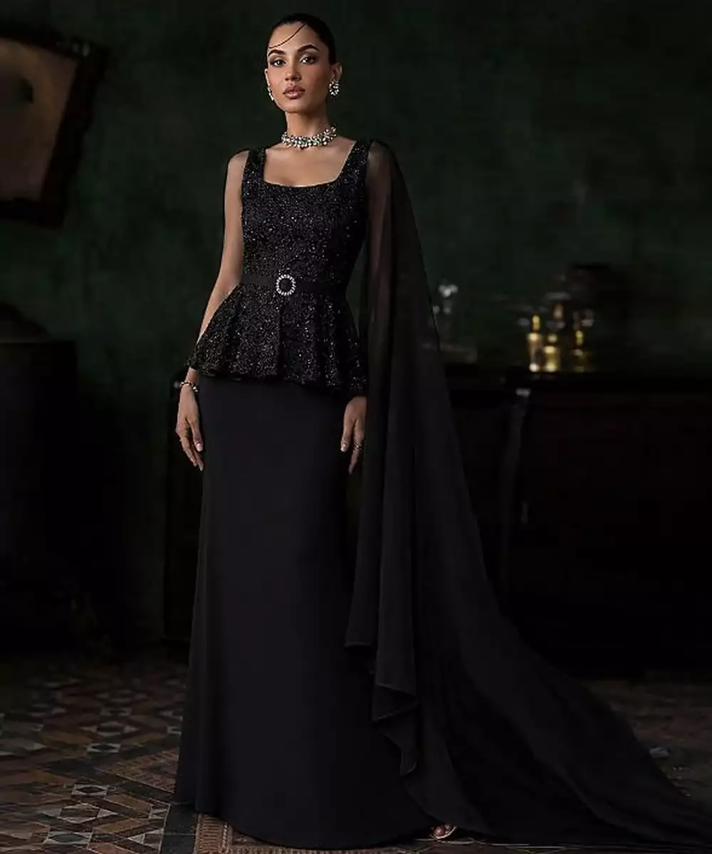 This Black Net Fusion Wear Is Detailed With Intricate Embroidery For A Bold Festive Appearance. The Sheer Fabric Adds Drama And Elegance. Ideal For Evening Parties And Contemporary Ethnic Occasions.