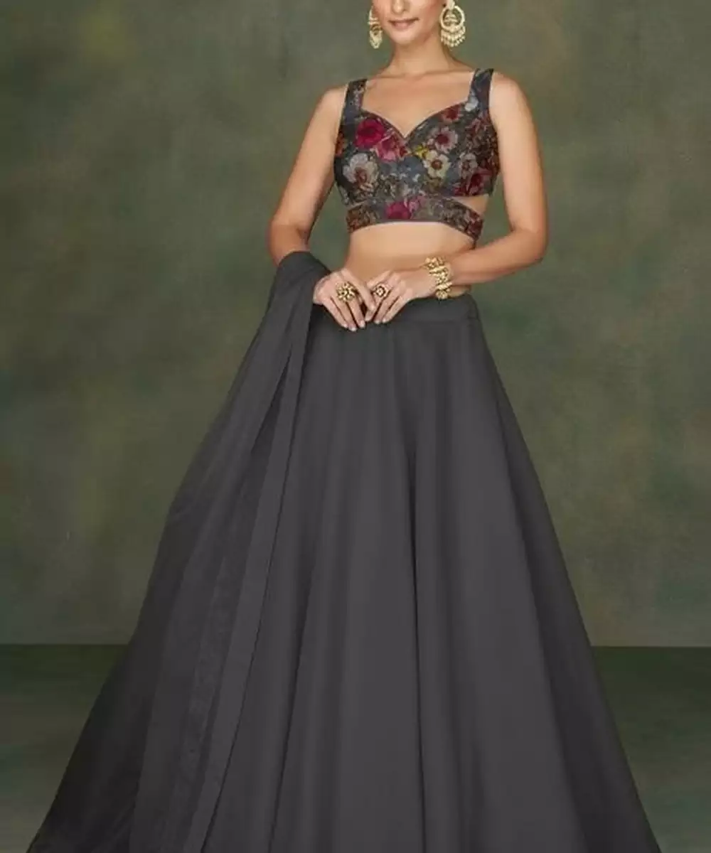 Black Floral Print Crepe Lehenga Set