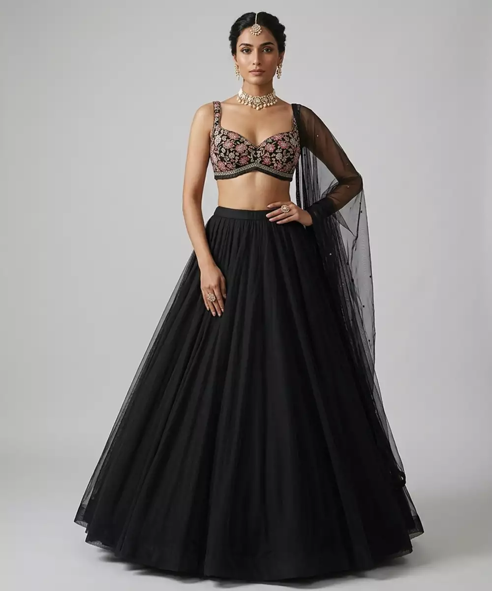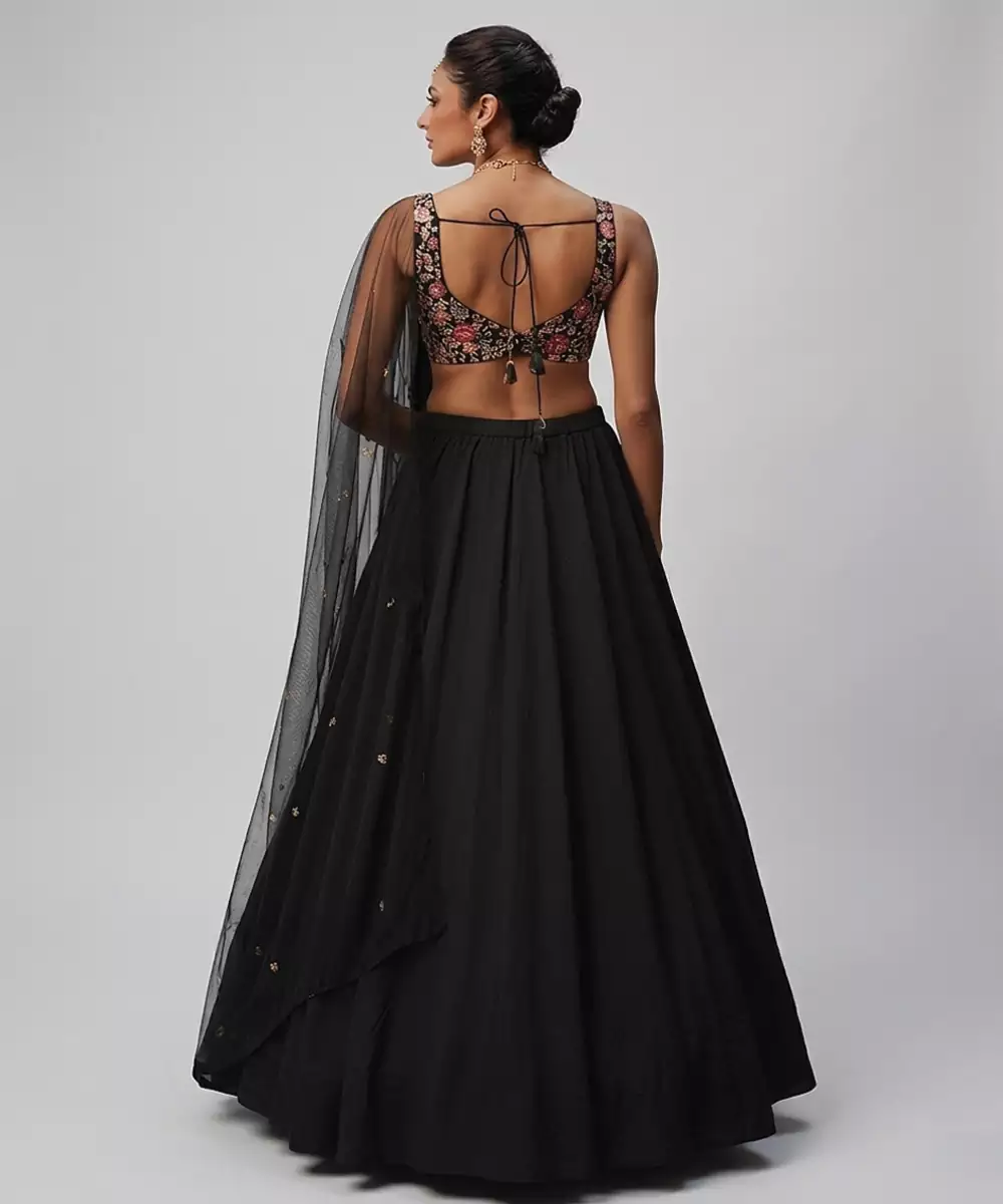 This Black Georgette Lehenga Set Exudes Timeless Elegance With Its Sleek And Flowy Design. The Lightweight Fabric Ensures A Graceful Drape And Comfortable Fit. Ideal For Evening Events Or Festive Occasions, It Pairs Beautifully With Statement Accessories For A Bold And Sophisticated Look.
