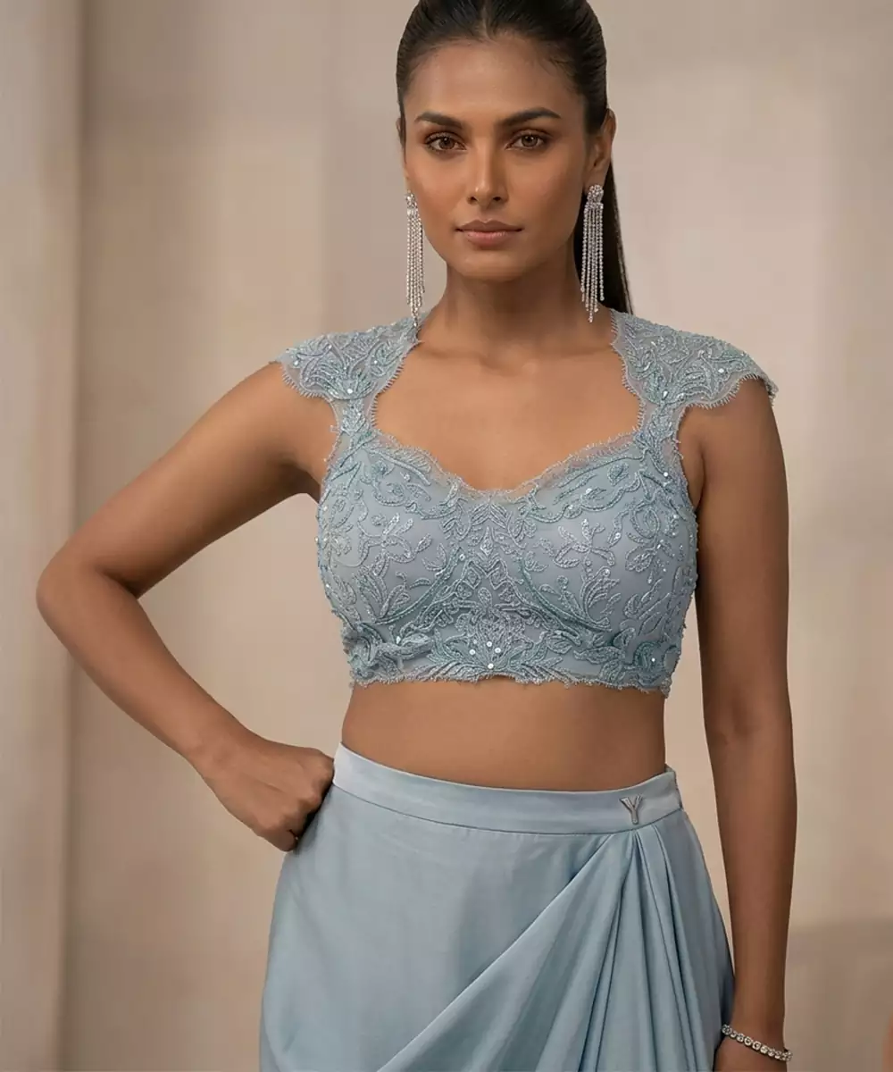This Blue Satin Co Ord Set Features Elegant Embroidery That Adds Charm To Its Modern Silhouette. The Smooth Fabric Offers A Subtle Sheen And Comfortable Fit. Perfect For Festive Gatherings Or Evening Events, It Pairs Beautifully With Minimal Accessories For A Polished Look.