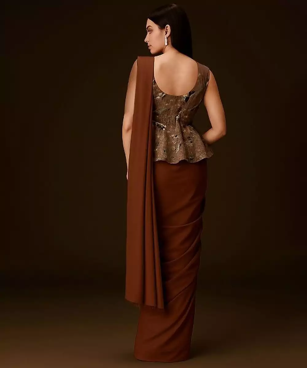 This Brown Poly Blend Pre Draped Saree Set Offers Modern Elegance With Practical Comfort. The Lightweight Fabric Ensures Durability And Ease Of Movement. Designed With A Contemporary Pre Draped Silhouette, It Is Ideal For Festive Events, Parties, And Stylish Celebrations.