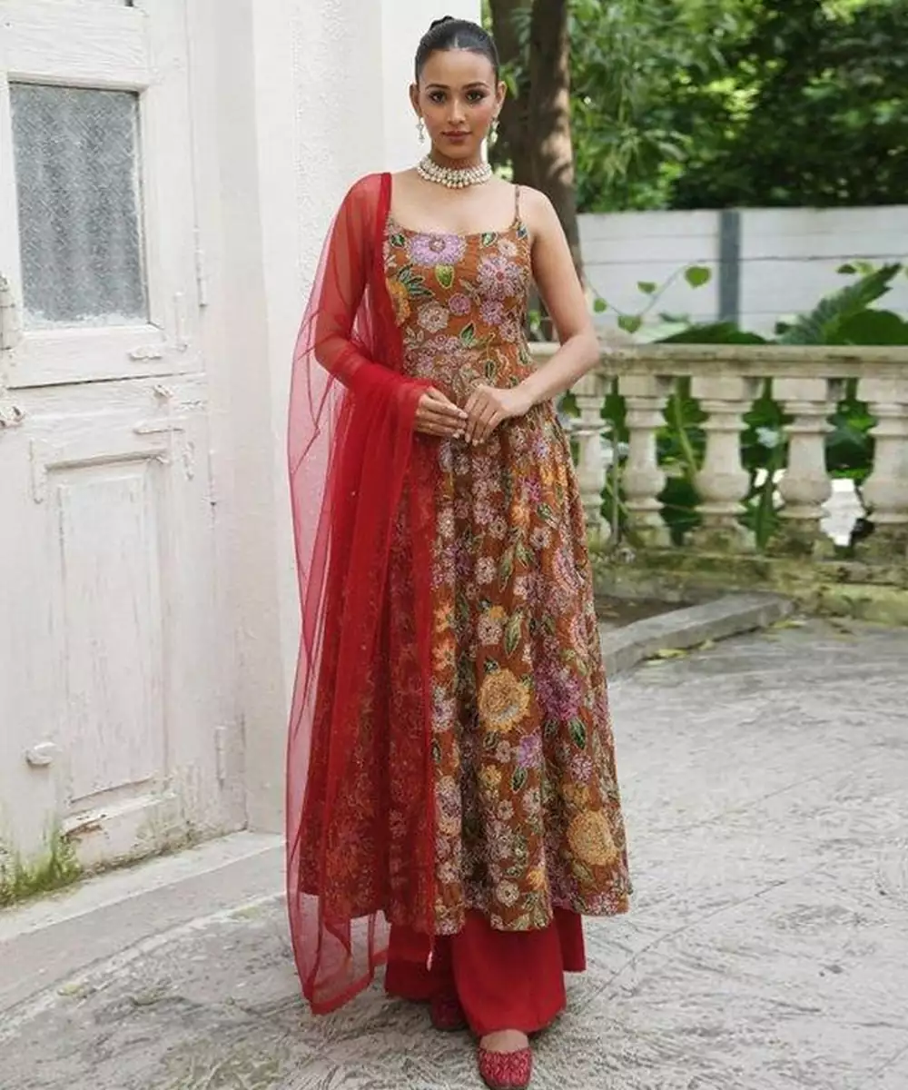 This Brown Printed Crepe Anarkali Set Features Artistic Prints That Enhance Its Ethnic Appeal. The Soft Crepe Fabric Ensures Comfort And A Flattering Drape. Ideal For Festive Gatherings, Daytime Functions, And Casual Celebrations With A Stylish Traditional Touch.