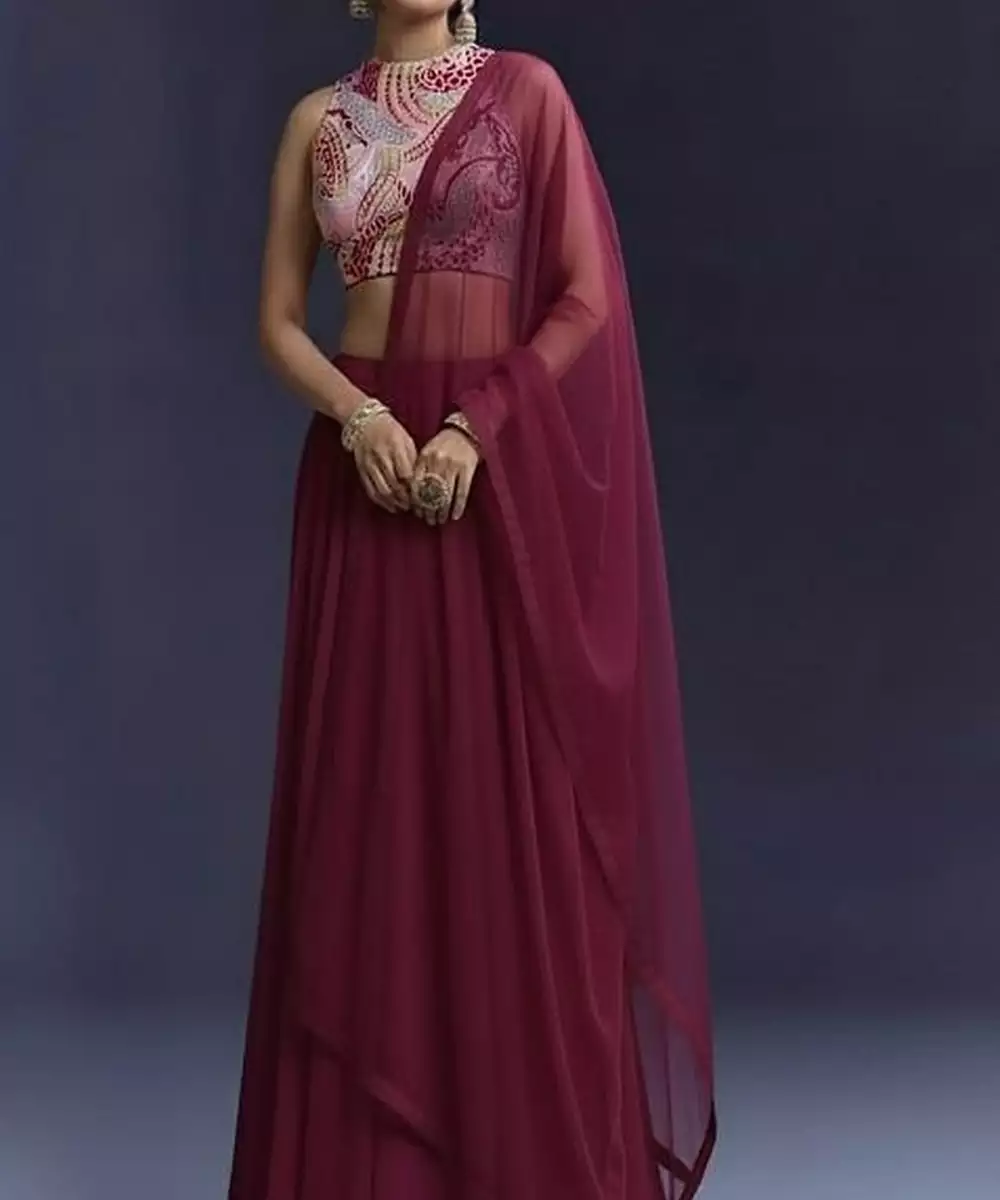 Burgundy Crepe Lehenga Set With Printed Blouse