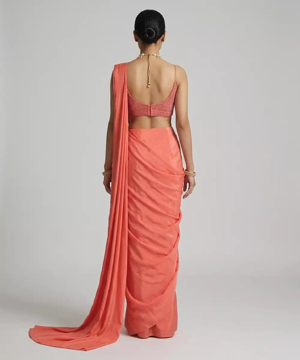 This Coral Pink Crepe Pre Draped Saree Set Features Intricate Handwork That Adds A Touch Of Elegance. The Soft Fabric Drapes Beautifully, Offering Both Comfort And Style. Perfect For Festive Occasions, It Pairs Seamlessly With Statement Jewelry For A Graceful And Sophisticated Appearance.