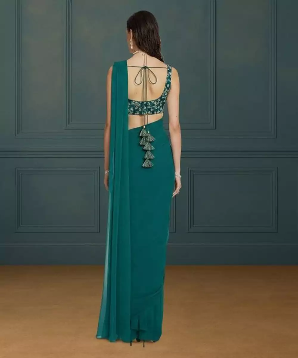 This Emerald Green Crepe Pre Draped Saree Set Showcases Timeless Sophistication With Modern Appeal. Crafted In Smooth Crepe Fabric, It Drapes Elegantly While Ensuring Comfort. The Rich Green Hue Enhances Its Festive Charm. Perfect For Weddings, Receptions, And Special Occasions.