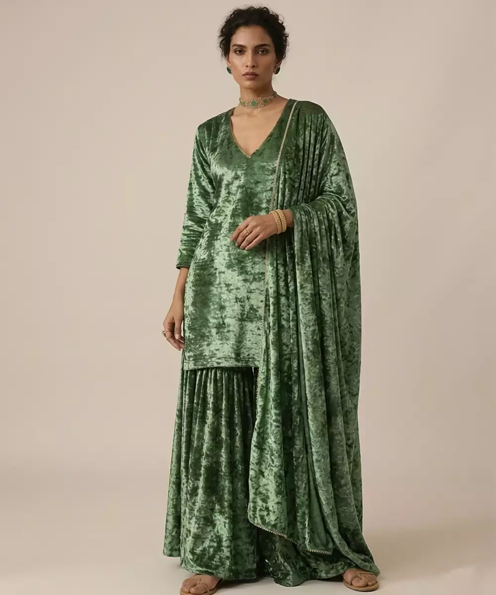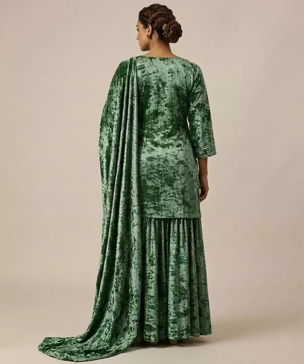 This Emerald Green Velvet Sharara Set Features Rich Woven Detailing That Enhances Its Luxurious Appeal. The Plush Fabric Adds Depth And Elegance, While The Flared Sharara Creates A Dramatic Silhouette. Perfect For Weddings Or Evening Events, It Pairs Beautifully With Statement Jewelry.