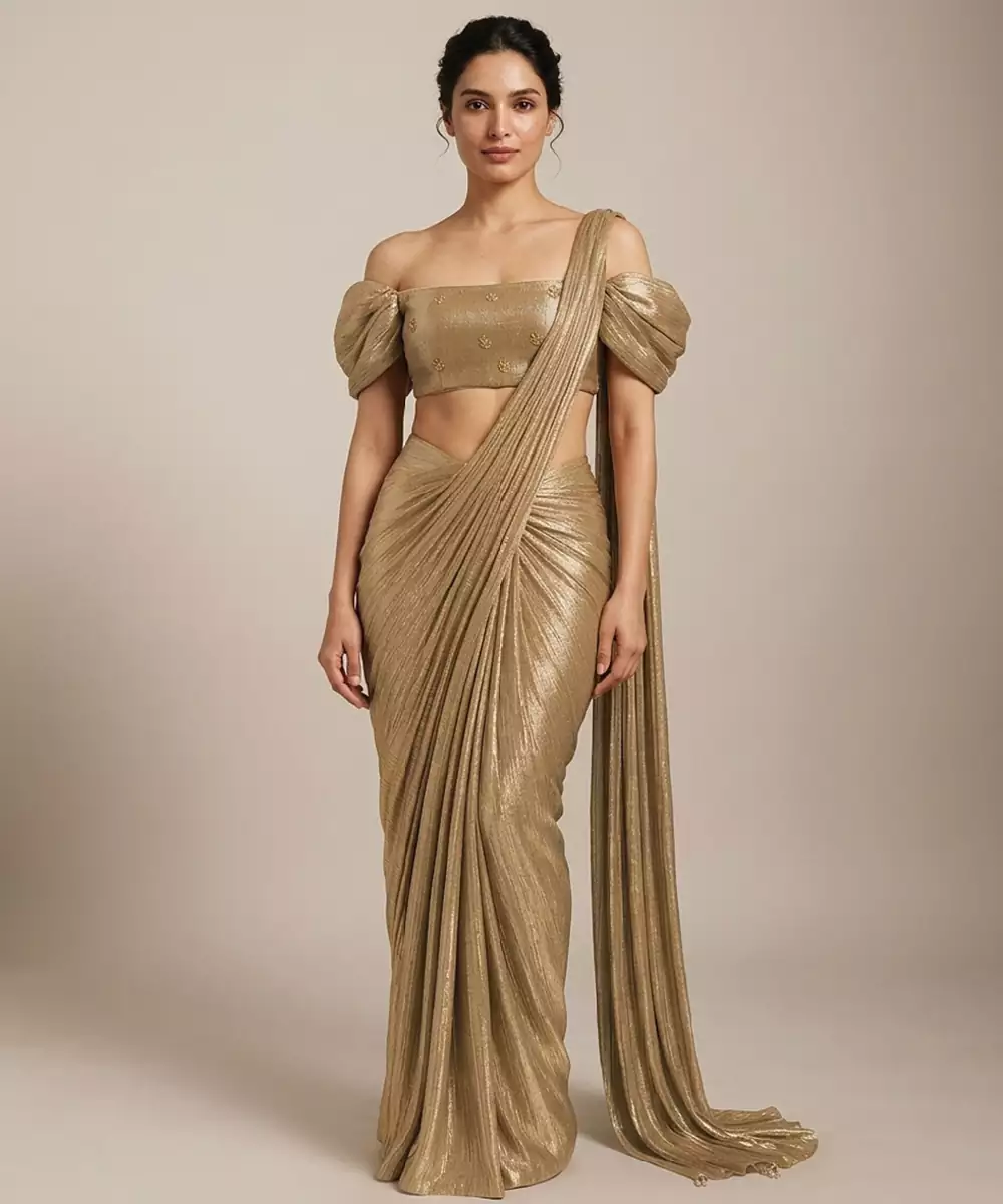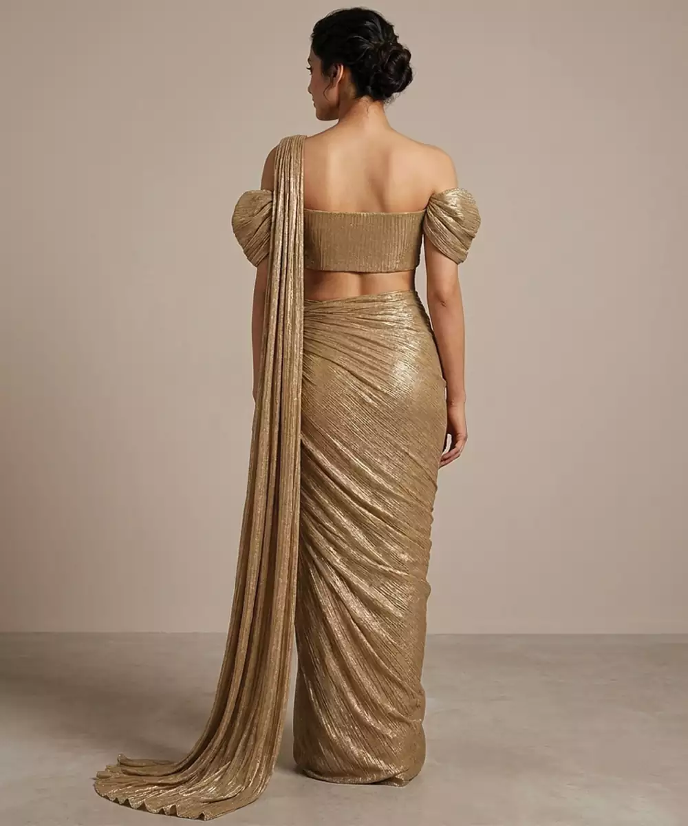 This Golden Foil Printed Knit Pre Draped Saree Set Features A Shimmering Finish That Enhances Its Modern Appeal. The Stretchable Fabric Ensures Comfort And Ease Of Wear. Perfect For Parties Or Festive Occasions, It Pairs Effortlessly With Statement Accessories For A Bold And Glamorous Look.