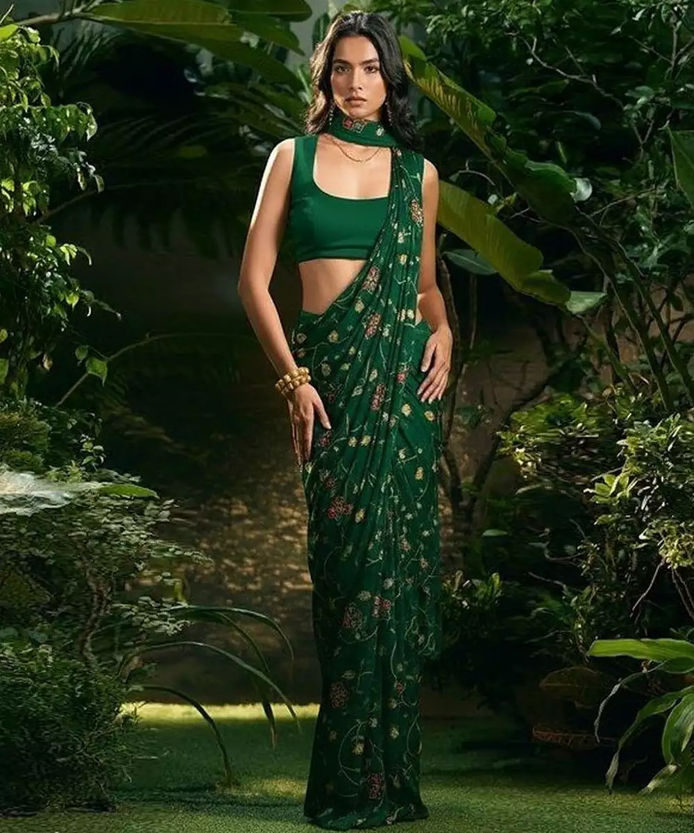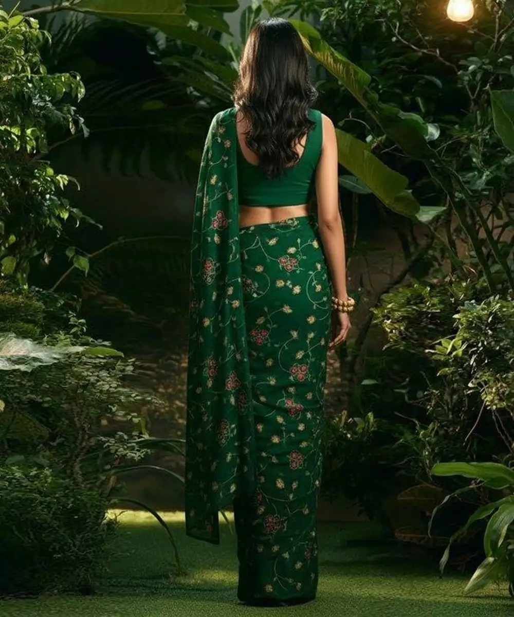 This Green Embroidered Silk Pre Draped Saree Set Showcases Timeless Elegance With Luxurious Detailing. Crafted From Rich Silk, Intricate Embroidery Enhances Its Festive Appeal. The Ready Draped Silhouette Ensures Effortless Wear. Perfect For Weddings, Receptions, And Special Celebrations.