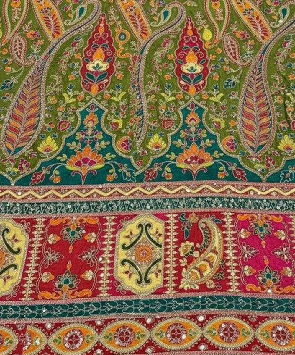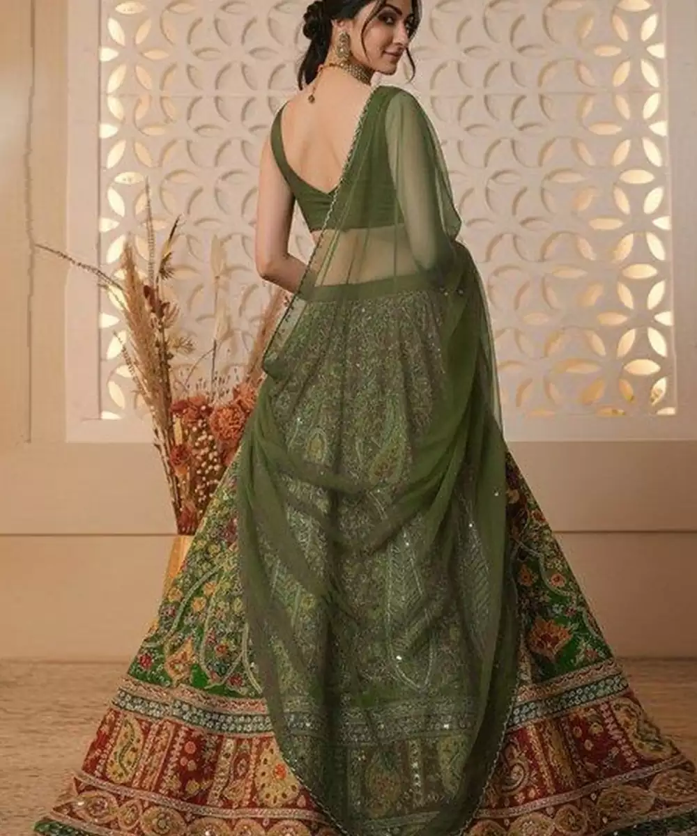 This Green Crepe Lehenga Set Showcases Artistic Prints That Enhance Its Graceful Festive Appeal. The Lightweight Fabric Offers Comfort And Fluid Drape. Paired With A Coordinated Blouse And Dupatta, It Is Ideal For Daytime Festivities And Traditional Celebrations.