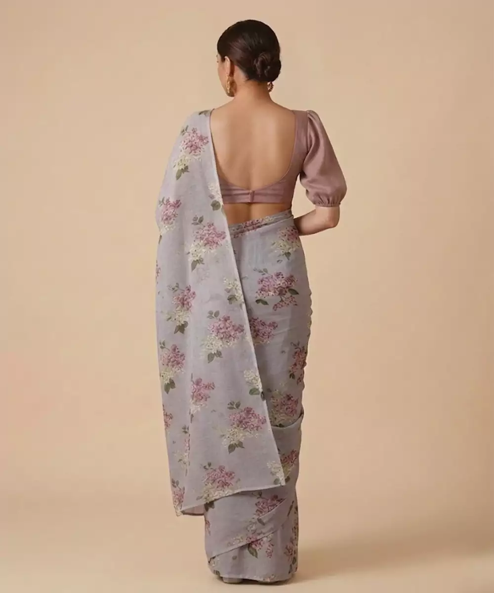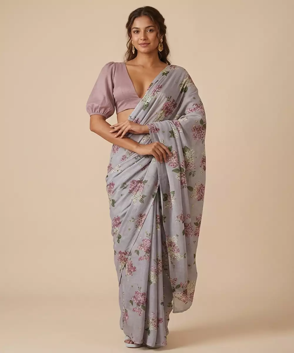 This Grey Georgette Pre Draped Saree Set Showcases Elegant Prints That Add A Contemporary Touch. The Lightweight Fabric Drapes Beautifully, Ensuring Comfort And Style. Ideal For Casual Celebrations Or Evening Events, It Pairs Effortlessly With Subtle Accessories For A Chic And Modern Appearance.