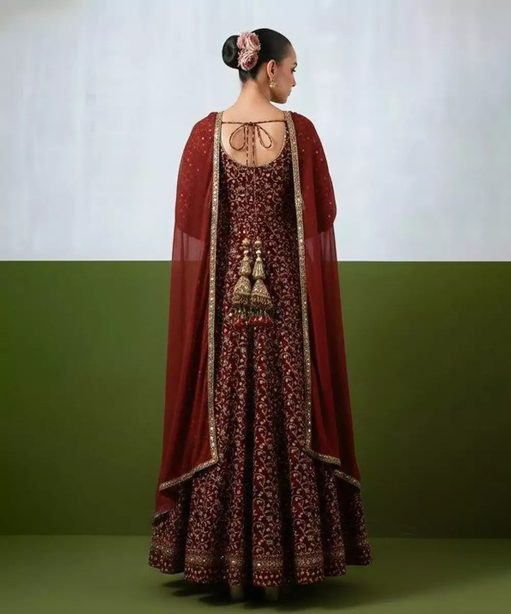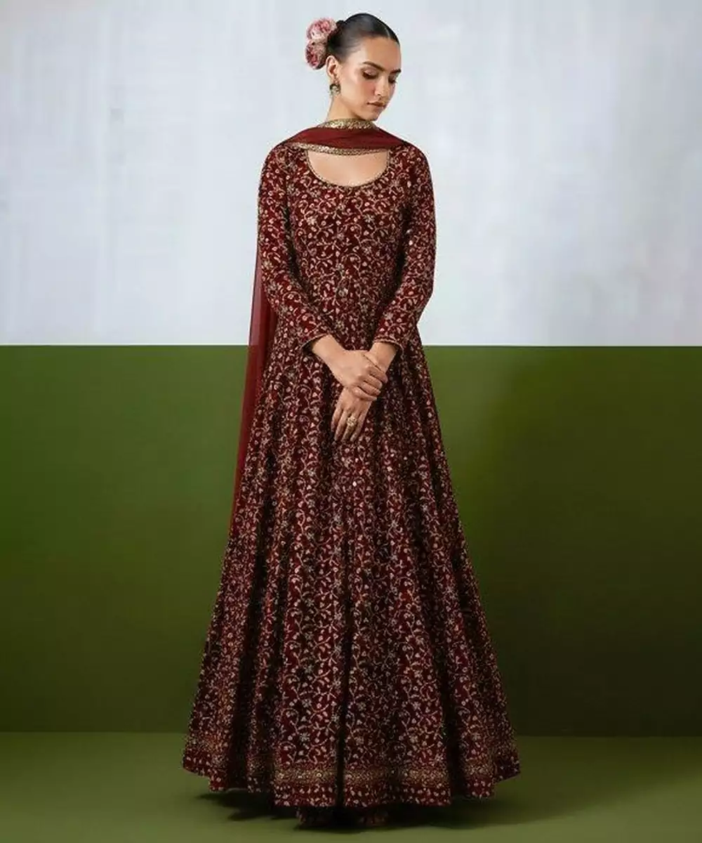 This Maroon Silk Anarkali Set Is Adorned With Intricate Embroidery For A Regal Festive Appearance. The Rich Silk Fabric Enhances Its Elegance While The Flared Silhouette Adds Grace. Perfect For Weddings, Receptions, And Traditional Evening Celebrations.