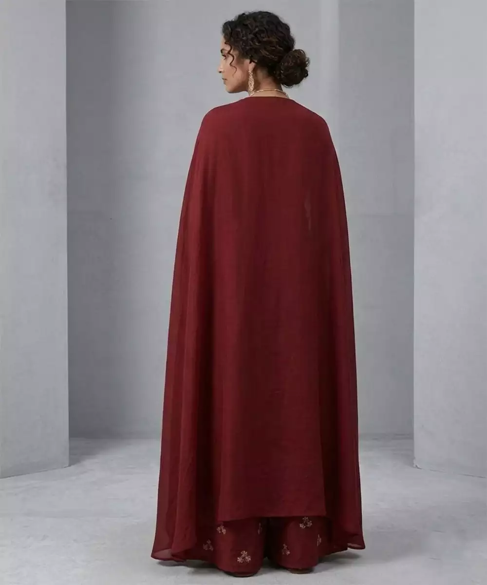 This Maroon Silk Sharara Set Features Intricate Embroidery That Enhances Its Rich And Festive Appeal. The Luxurious Fabric Offers A Smooth Texture, While The Flared Sharara Adds Graceful Movement. Perfect For Weddings And Celebrations, It Pairs Beautifully With Statement Jewelry For A Regal And Sophisticated Look.
