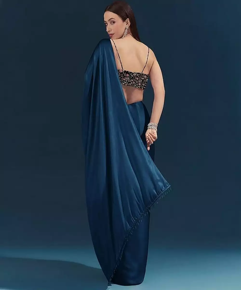 This Midnight Blue Velvet Pre Draped Saree Set Exudes Luxurious Sophistication. The Rich Velvet Fabric Adds Depth And Elegance While The Pre Draped Style Offers A Modern Silhouette. Perfect For Evening Parties, Receptions, And Festive Celebrations Where You Want To Make A Bold Statement.