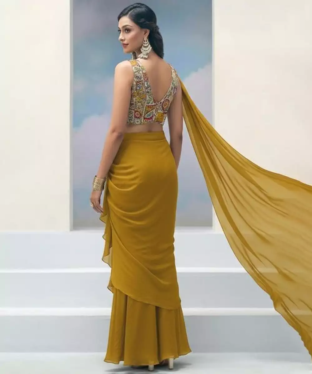 This Mustard Crepe Pre Draped Saree Set Features A Vibrant Color That Radiates Festive Charm. The Soft Crepe Fabric Ensures Comfort And A Flattering Drape. Designed For Easy Styling, The Pre Stitched Silhouette Offers Modern Convenience. Perfect For Festive Gatherings, Cultural Events, And Celebrations.
