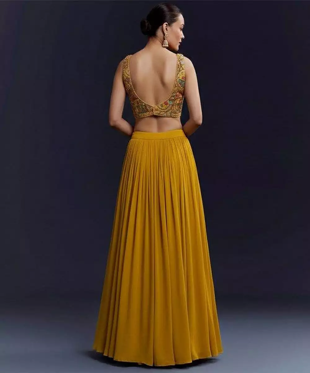 This Mustard Yellow Crepe Lehenga Set Offers A Vibrant And Elegant Ethnic Look. The Soft Crepe Fabric Drapes Beautifully While The Flared Silhouette Adds Charm And Comfort. Styled With A Matching Blouse And Dupatta, It Is Perfect For Festive Occasions, Daytime Weddings, And Celebratory Gatherings.
