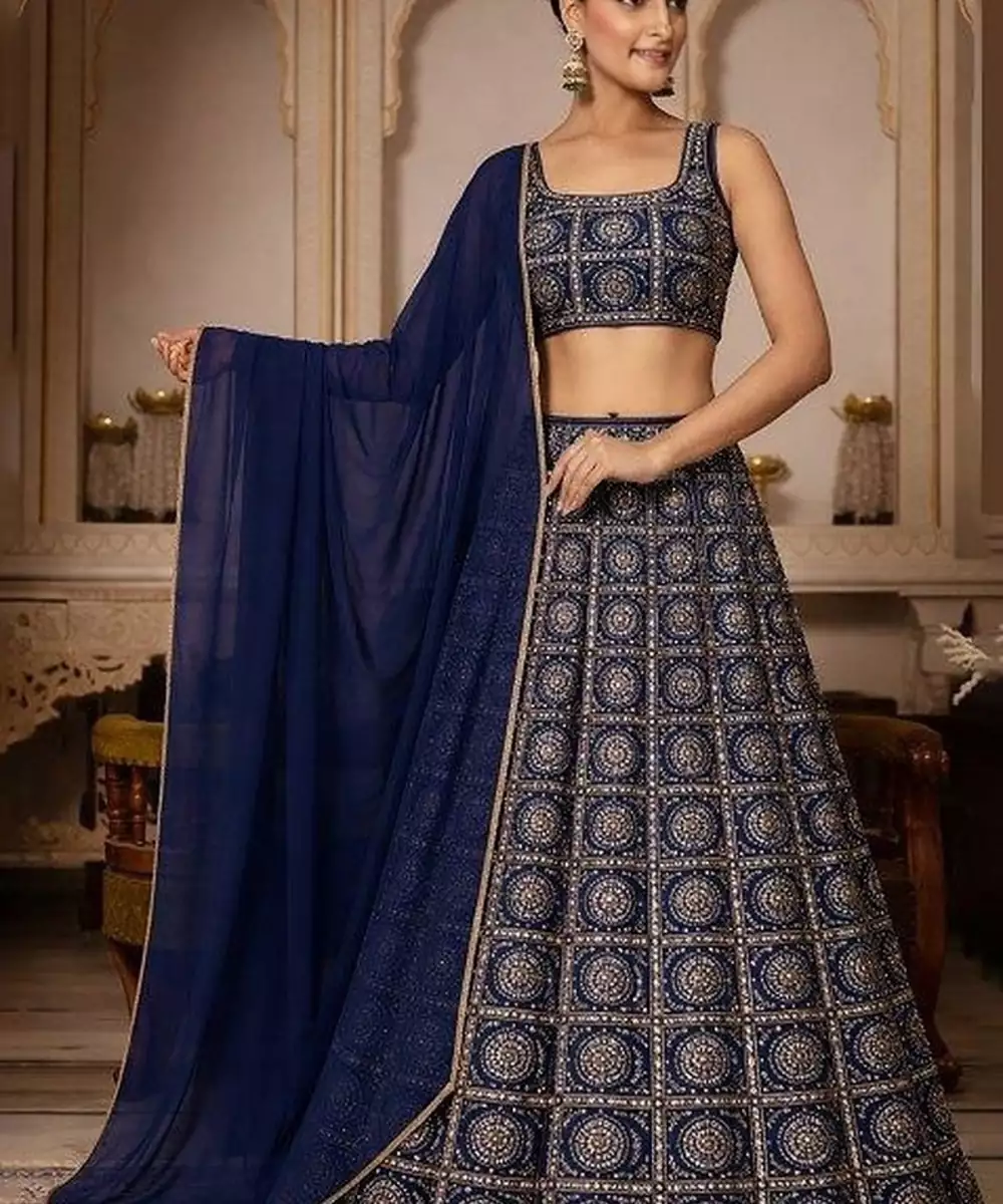 Navy Blue Bandhani Print Chinon Lehenga Set