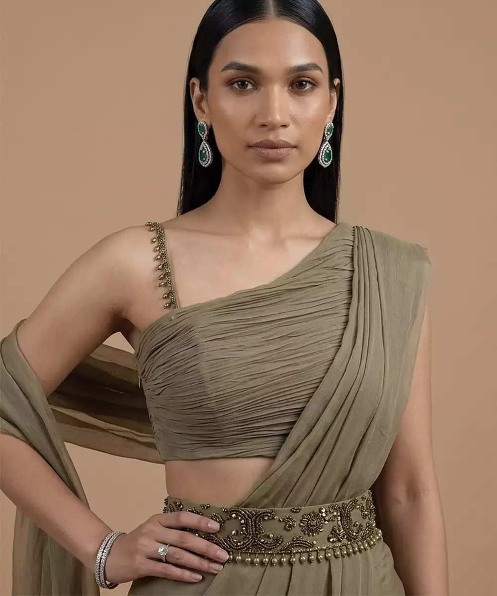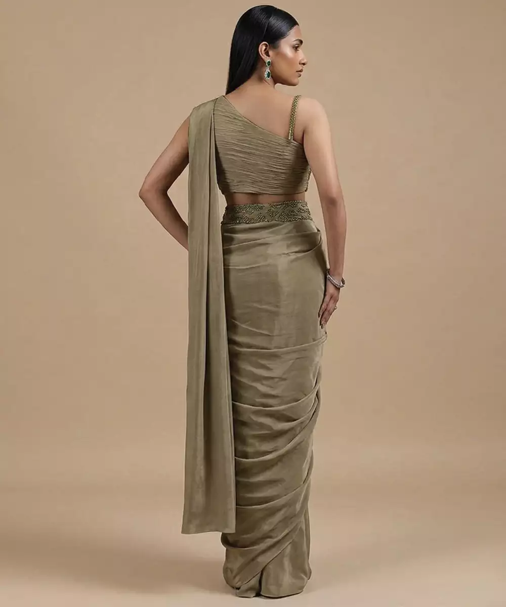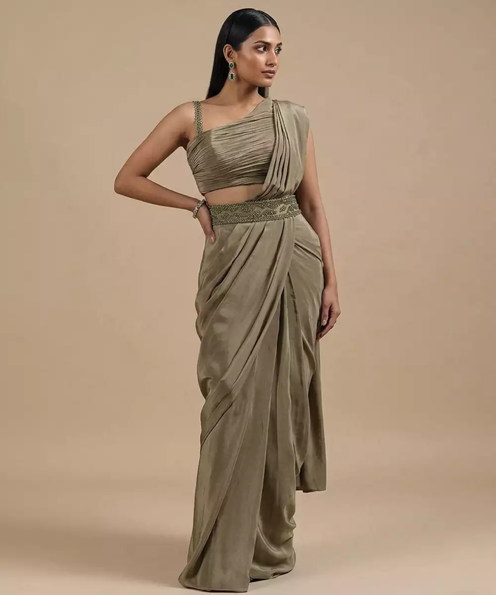 This Olive Green Satin Pre Draped Saree Set Offers A Luxurious Sheen And Smooth Texture. The Ready Silhouette Ensures Comfort And Effortless Styling. Ideal For Festive Occasions Or Evening Events, It Pairs Beautifully With Minimal Accessories For A Sophisticated And Contemporary Look.