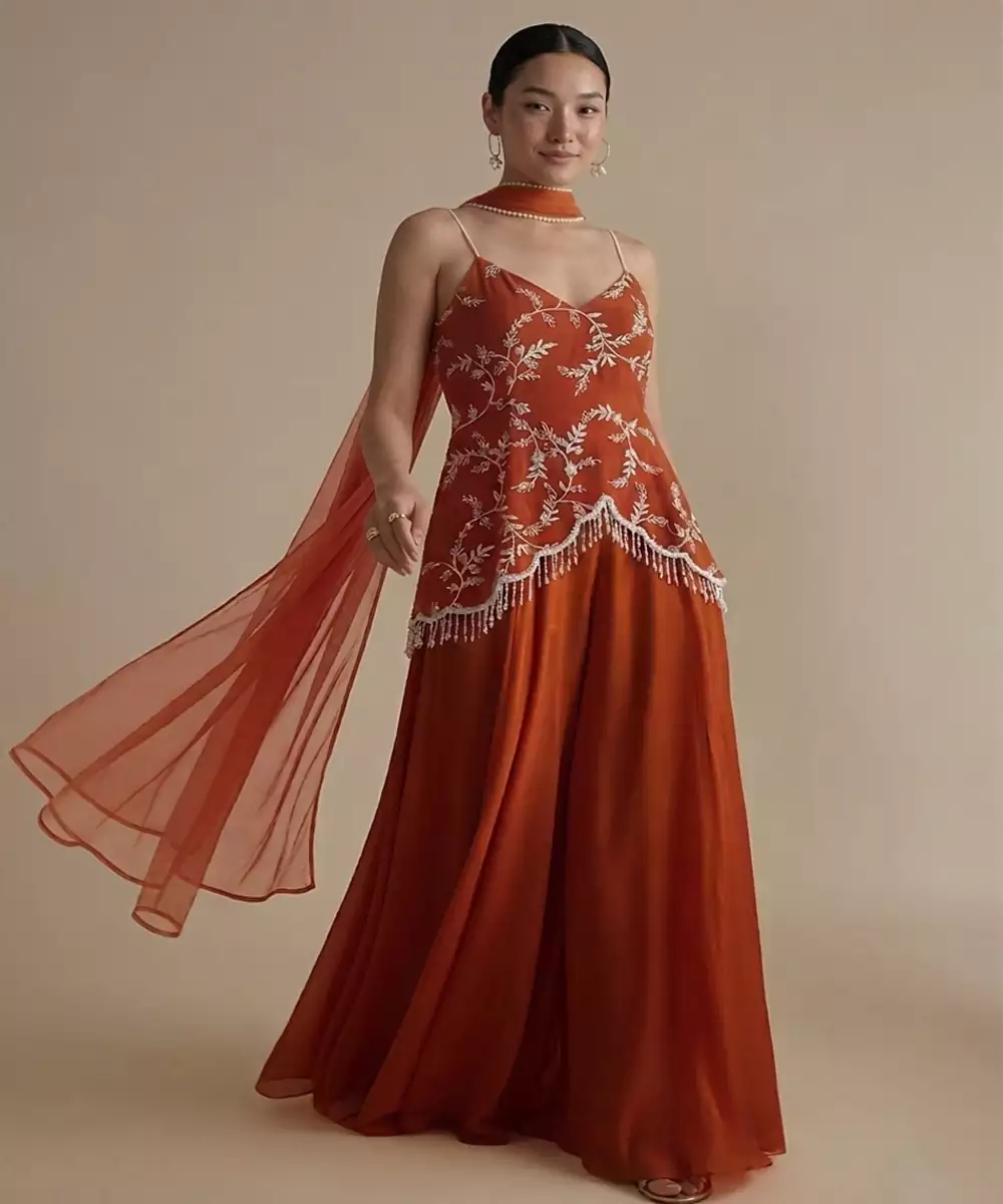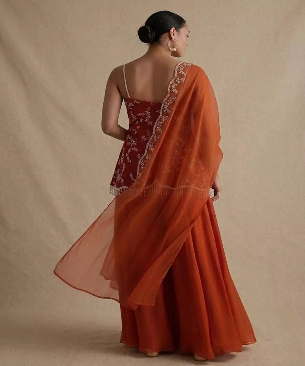 This Orange Crepe Co Ord Set Showcases Intricate Embroidery That Adds Vibrancy To Its Modern Silhouette. The Lightweight Fabric Ensures Comfort While Maintaining Style. Perfect For Festive Gatherings, It Pairs Effortlessly With Statement Accessories For A Chic And Lively Ensemble.