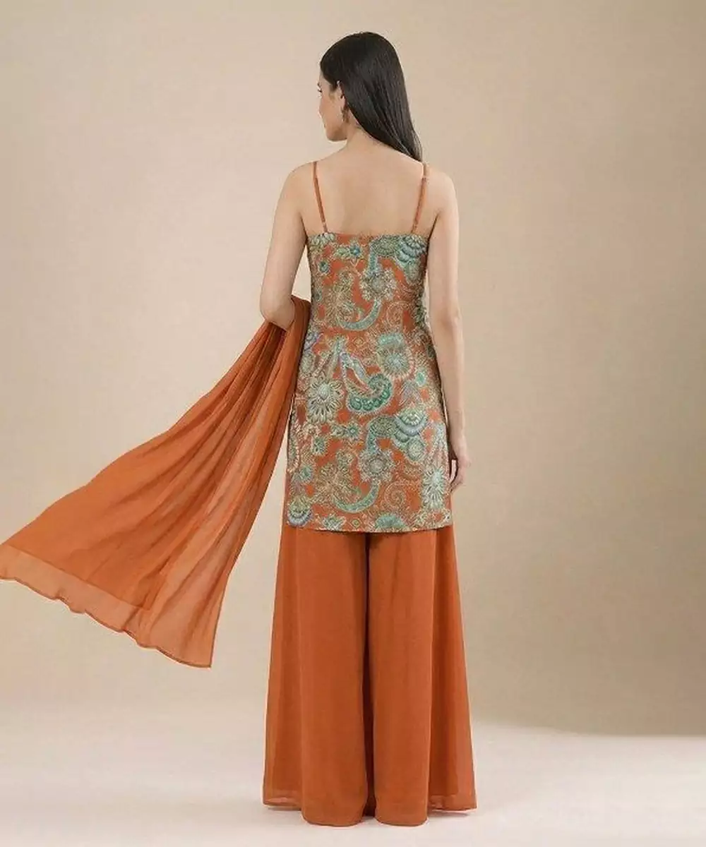 This Orange Georgette Sharara Set Showcases Vibrant Prints For A Bright Festive Look. The Lightweight Fabric Flows Gracefully And Ensures Comfort. Perfect For Daytime Festivities And Joyful Traditional Occasions.