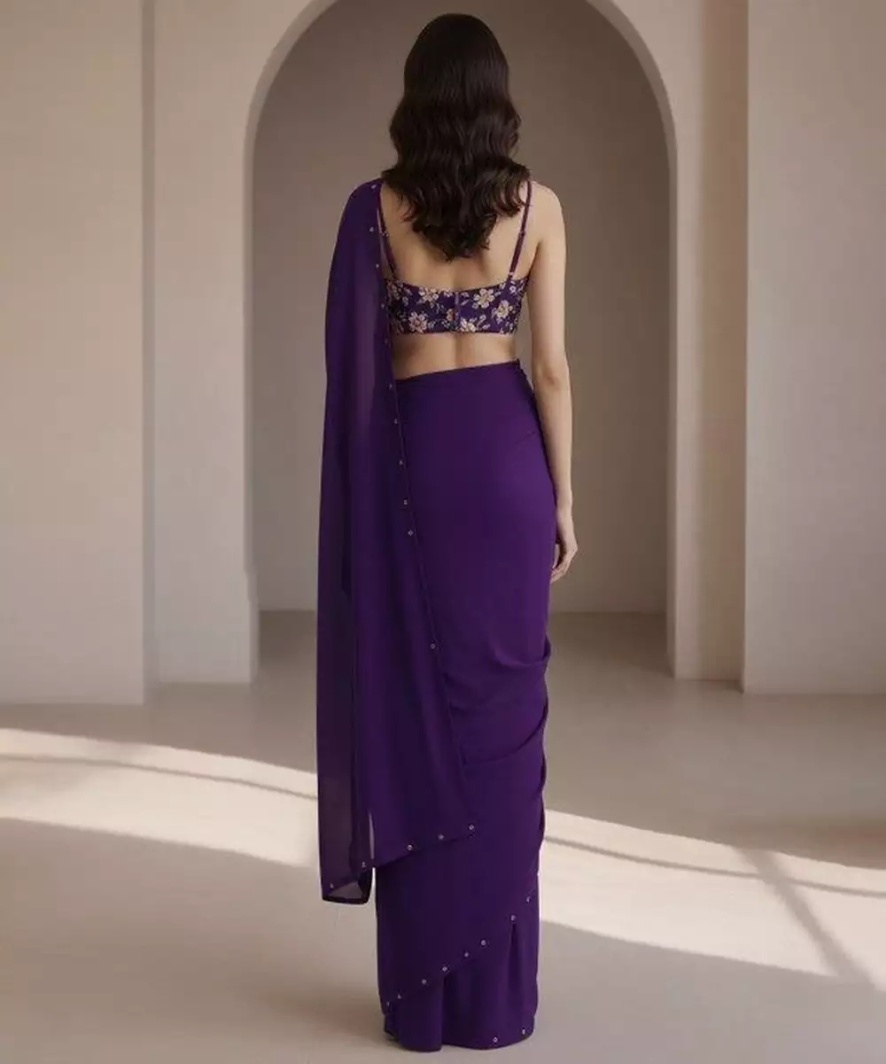 This Purple Crepe Pre Draped Saree Set Exudes Understated Elegance With A Modern Silhouette. The Smooth Crepe Fabric Provides Comfort And Graceful Draping. Designed For Easy Wear, The Pre Stitched Style Makes Dressing Effortless. Perfect For Festive Gatherings, Parties, And Elegant Celebrations.