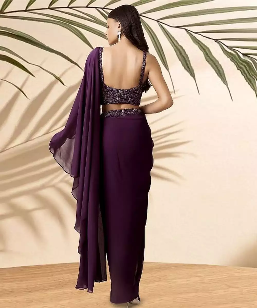This Purple Embroidered Georgette Pre Draped Saree Set Combines Flowing Elegance With Intricate Craftsmanship. The Lightweight Georgette Fabric Ensures Comfort While Embroidery Enhances Its Festive Appeal. The Ready Drape Design Makes Styling Effortless. Perfect For Celebrations, Weddings, And Evening Gatherings.
