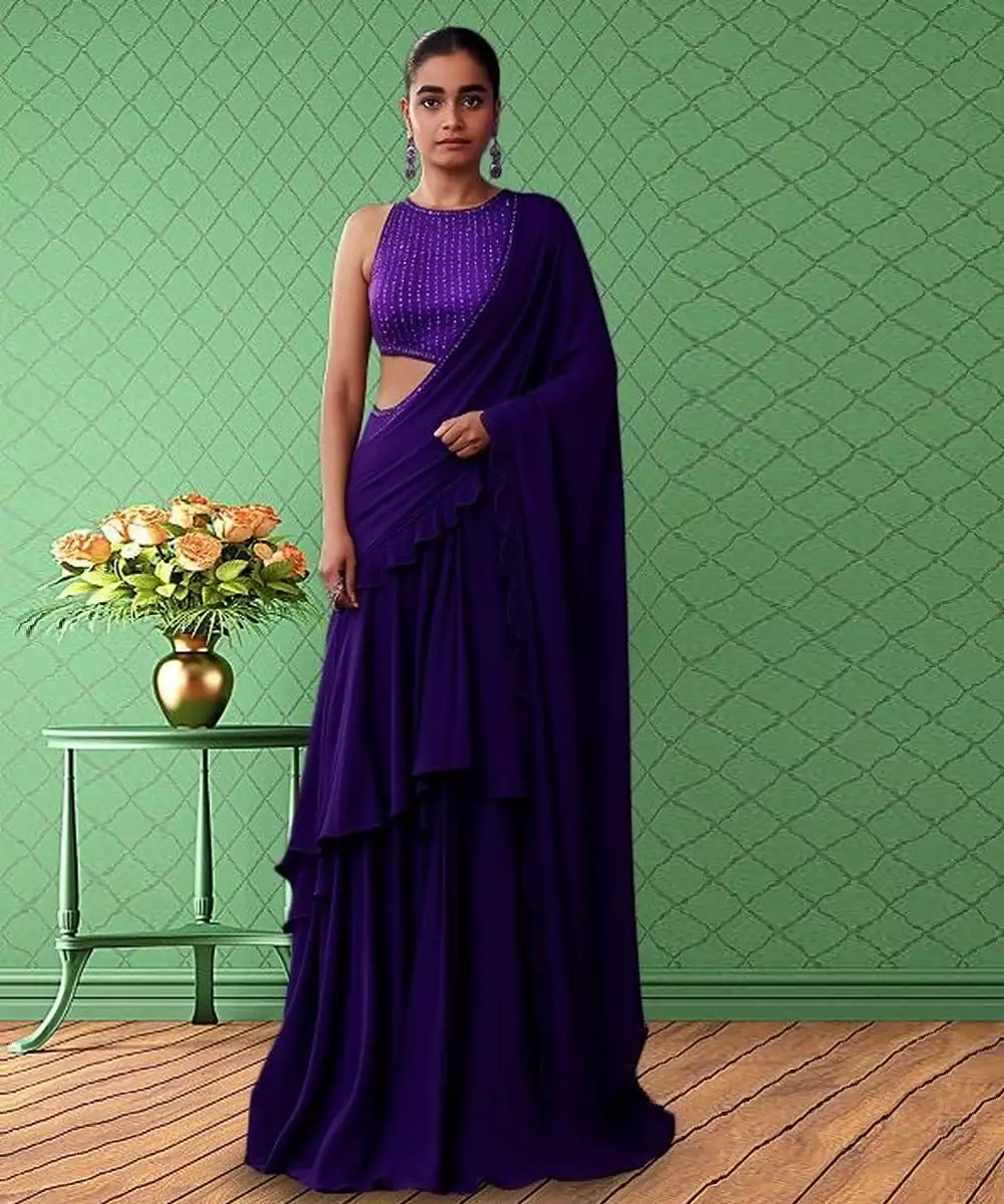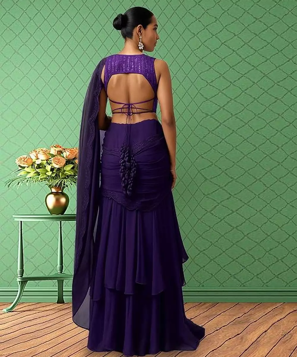 This Purple Net Pre Draped Saree Set Exudes Graceful Elegance With A Contemporary Twist. The Sheer Net Fabric Creates A Delicate And Stylish Look While The Pre Draped Design Ensures Effortless Wear. Perfect For Evening Parties, Festive Occasions, And Celebrations Where Sophistication Meets Modern Fashion.