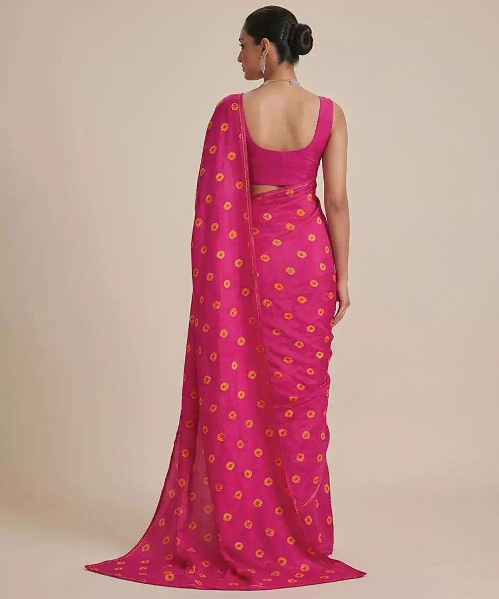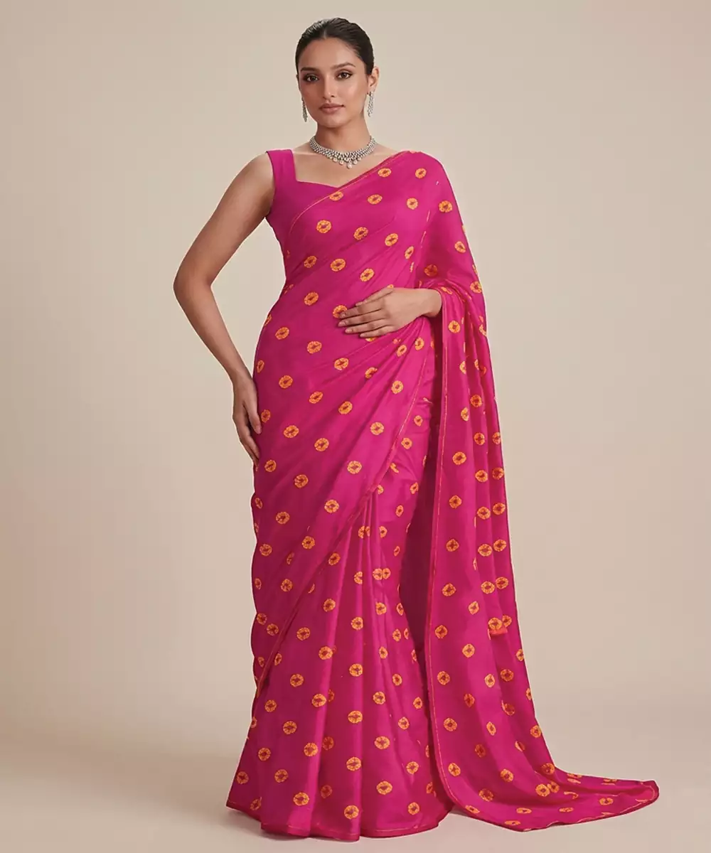This Rani Pink Satin Pre Draped Saree Set Showcases Vibrant Prints That Enhance Its Bold And Festive Charm. The Smooth Fabric Offers A Subtle Sheen, While The Ready Silhouette Ensures Comfort And Style. Ideal For Celebrations, It Pairs Effortlessly With Minimal Accessories For A Chic And Elegant Look.