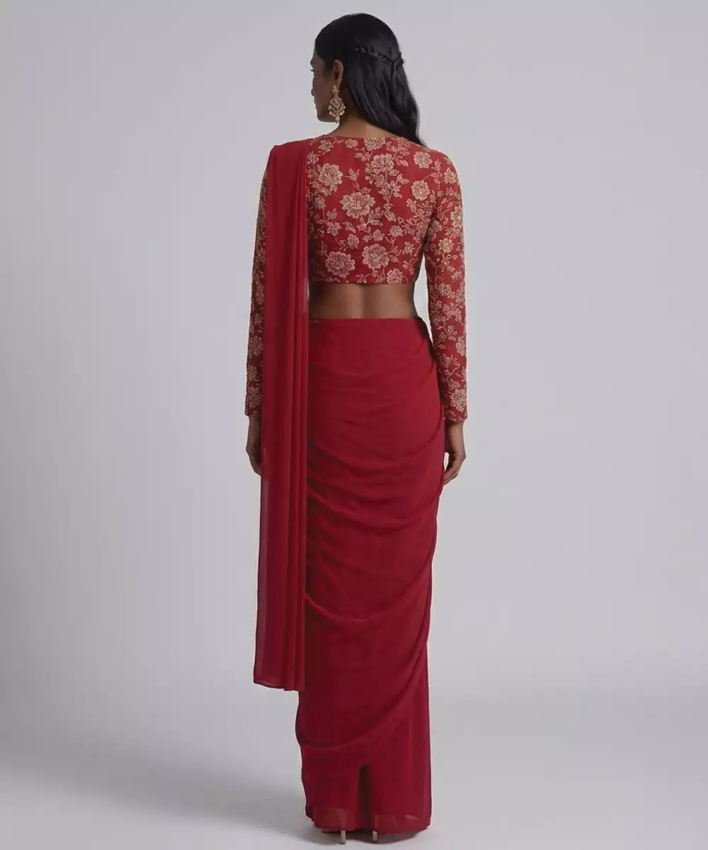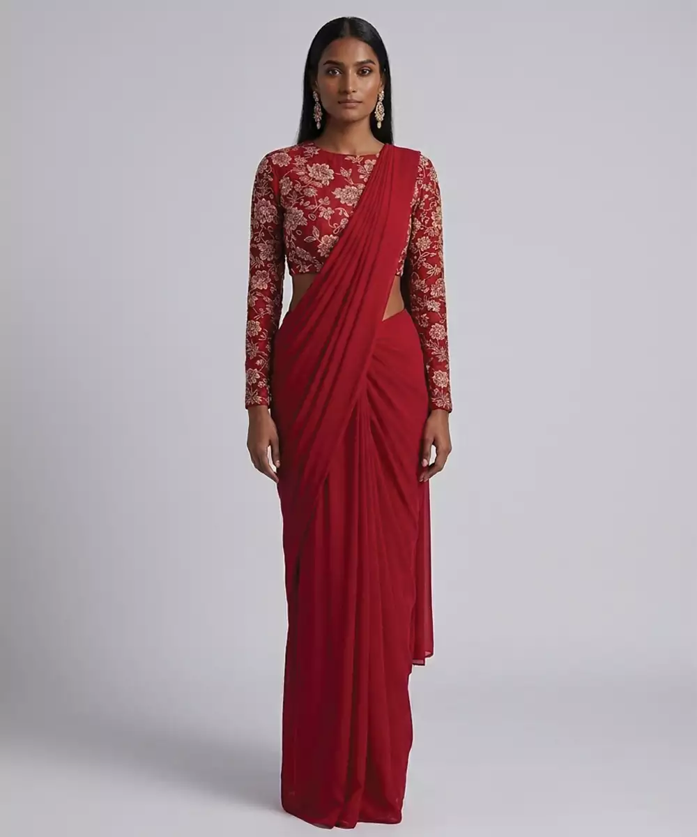 This Red Crepe Pre Draped Saree Set Features A Bold And Timeless Design With A Smooth Finish. The Lightweight Fabric Ensures A Graceful Drape And Comfortable Fit. Perfect For Festive Occasions Or Celebrations, It Pairs Beautifully With Statement Jewelry For A Striking And Elegant Look.