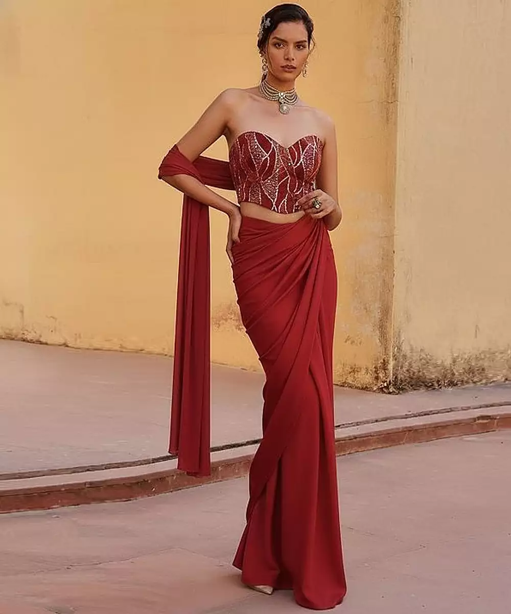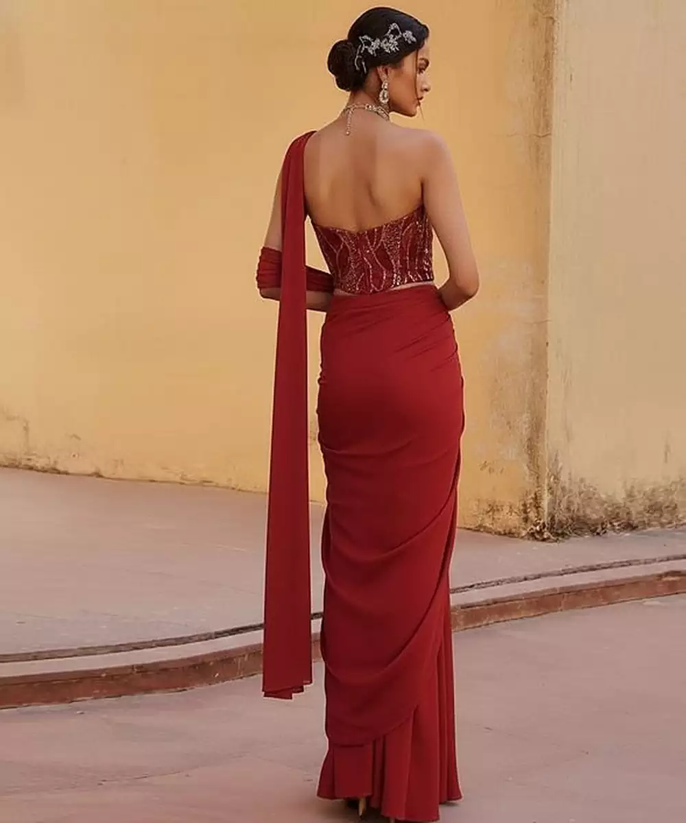 This Red Georgette Pre Draped Saree Set Radiates Timeless Festive Charm. The Flowing Georgette Fabric Ensures Comfort And Graceful Movement. Designed For Effortless Wear, The Pre Stitched Drape Offers Modern Convenience. Perfect For Weddings, Celebrations, And Festive Occasions.